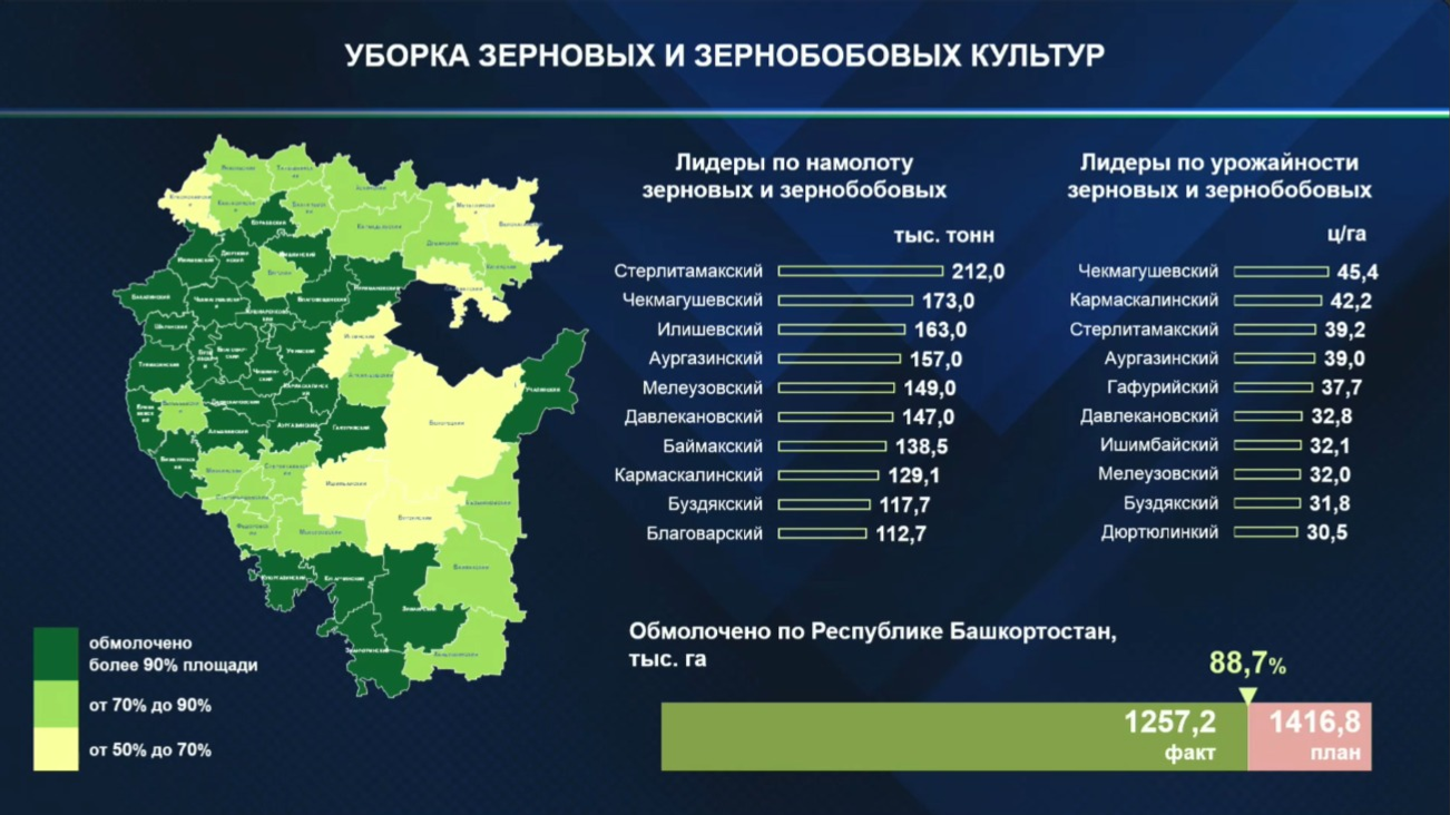В республике более 89 процентов зерновых уже убрано. На данный момент валовой намолот зерна составляет 3,4 миллиона тонн при средней урожайности 27,5 ц/га. Лидером по намолоту зерновых и зернобобовых культур стал Стерлитамакский район, здесь намолотили более 210 тысяч тонн. Также более 150 тысяч тонн убрано в Чекмагушевском, Илишевском, Аургазинском и Мелеузовском районах. По урожайности зерновых культур лидируют Чекмагушевский, Кармаскалинский, Стерлитамакский и Аургазинский районы.