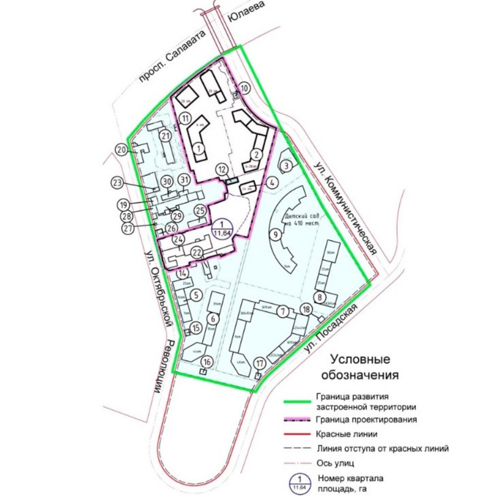 В Уфе изменен проект планировки квартала, ограниченного проспектом Салавата Юлаева, улицами Коммунистической, Посадской, территорией сквера у Монумента Дружбы и улицей Октябрьской революции. Соответствующее постановление опубликовано на сайте администрации города.
