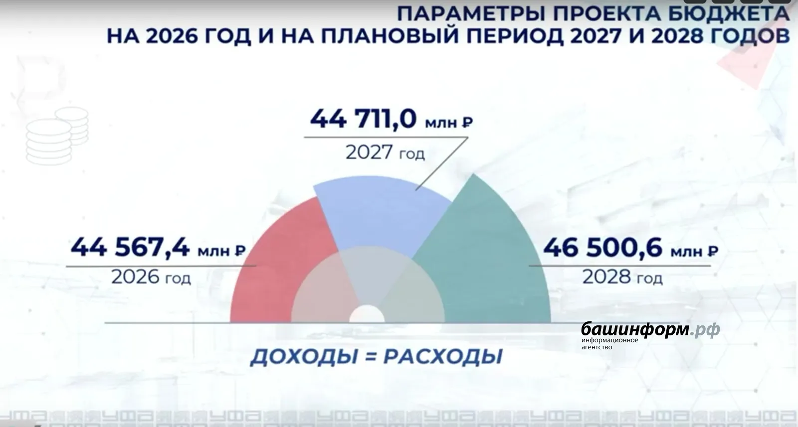 Доходы Уфы на 2026 год планируются в размере 44,5 млрд руб., на 2027 год — 44,7 млрд руб., а на 2028 — 46,5 млрд руб. Расходы планируются в таком же объёме, то есть дефицита бюджета не планируется.