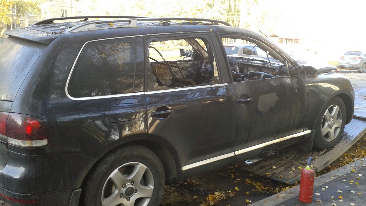 УФА, 29 сен 2014. /ИА «Башинформ», Ольга Муртазина/. В Уфе в минувшие выходные от огня пострадали три автомобиля. Во дворе на улице Вологодской в субботу ночью обгорел салон и частично моторный отсек внедорожника Volkswagen Touareg.