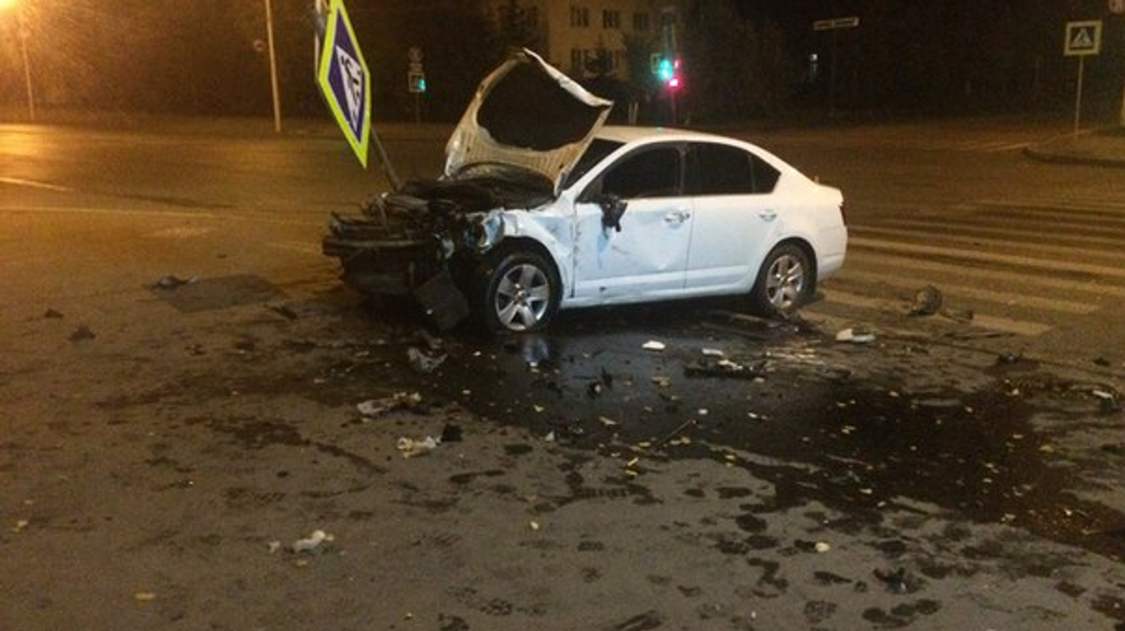 Вероятно, авария произошла по вине нарушителя, проскочившего на красный сигнал светофора. «Шкоду Октавию» отбросило на столб электроопоры, водителя спасли подушки безопасности.