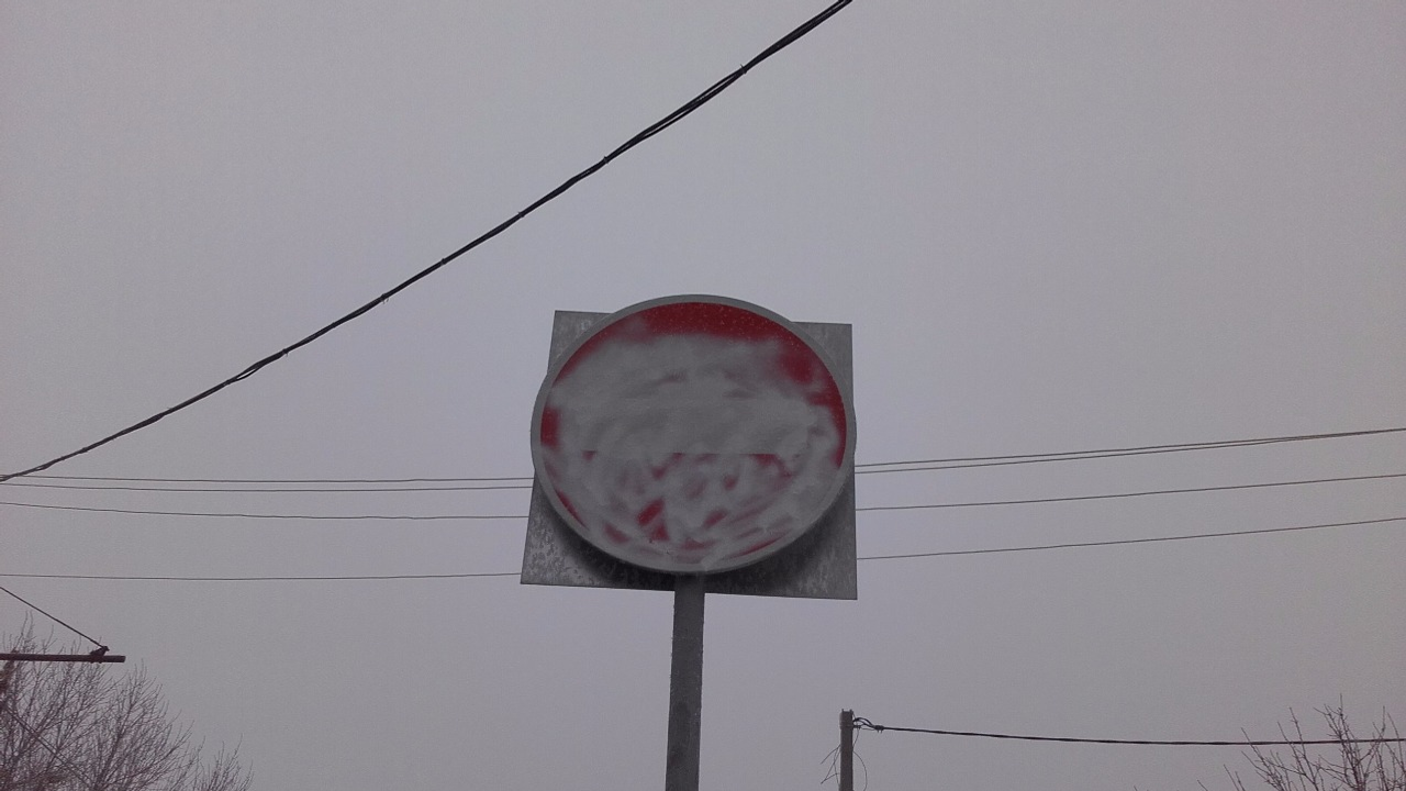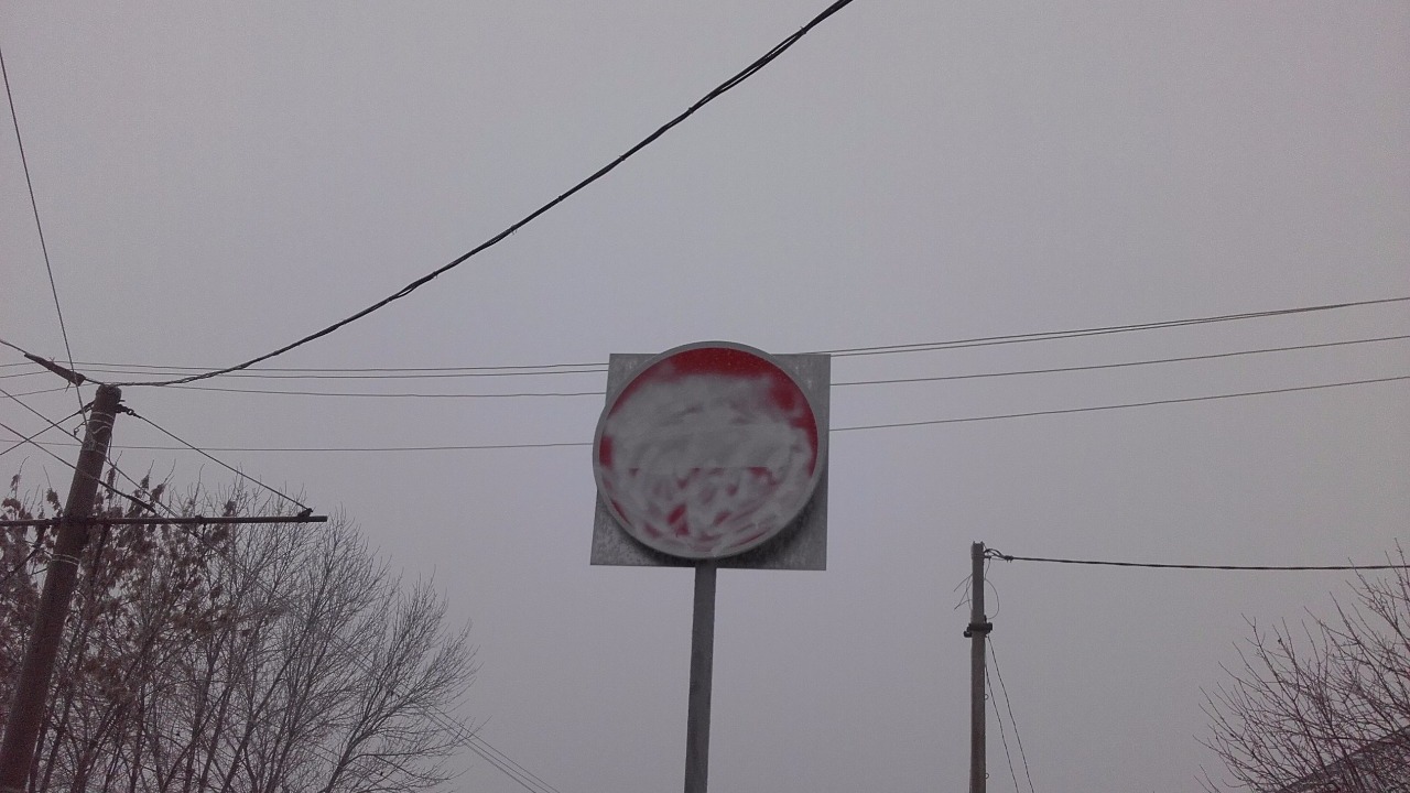 На снимках видно, что серебристой краской неизвестные закрасили дорожный знак «3.1 Въезд запрещен», расположенный на пересечении улиц Мингажева и Чернышевского.