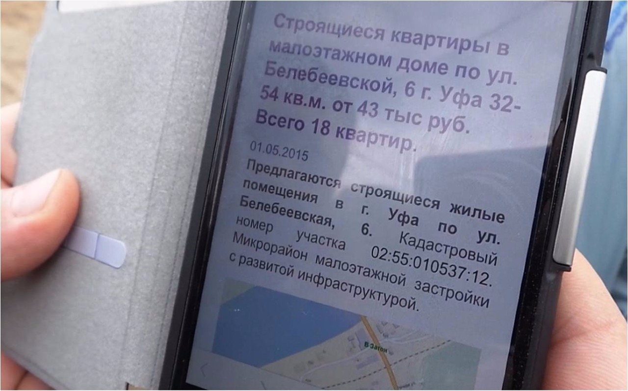 Алексей Михайленко через мобильный интернет на сайте известной в столице риэлторской фирмы нашел объявление, размещенное еще 1 мая 2015 года, о продаже 18 квартир в малоэтажном доме №6 по улице Белебеевской.