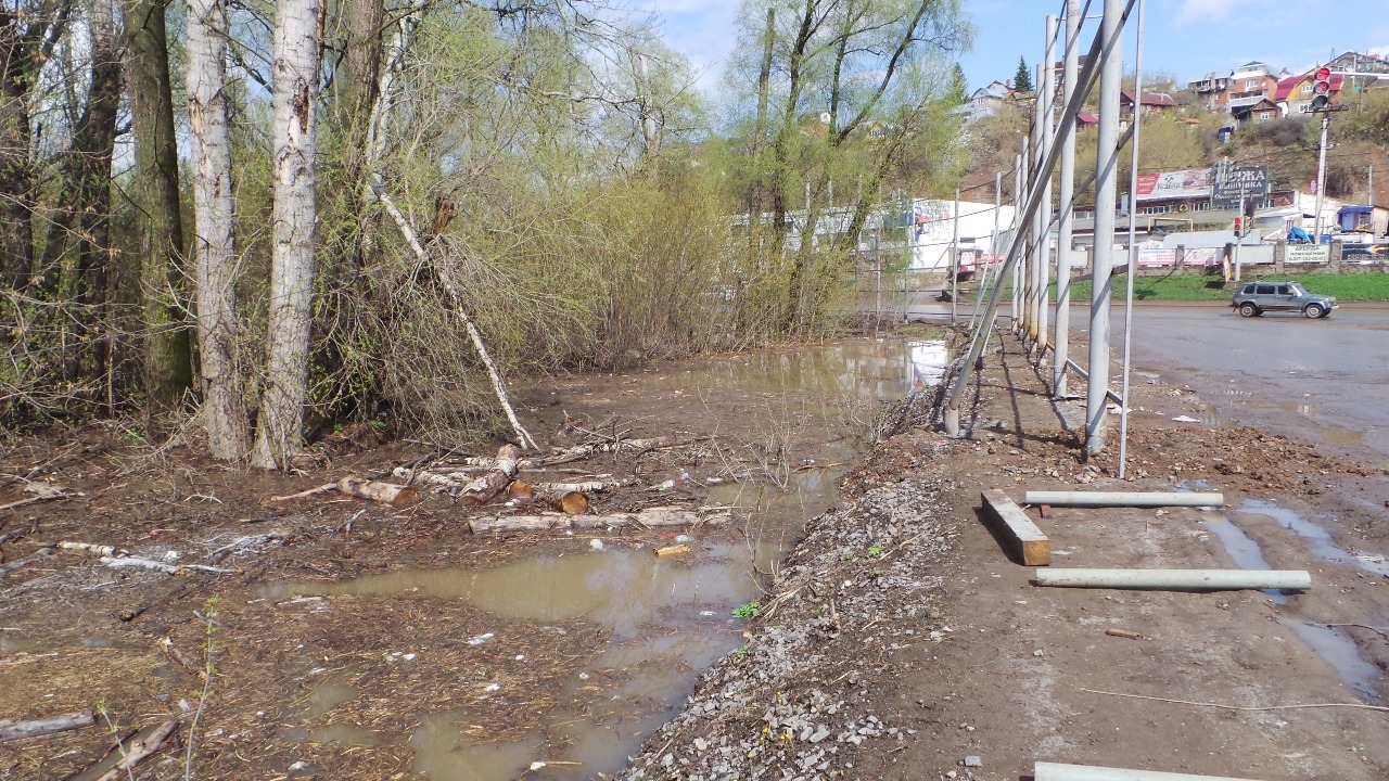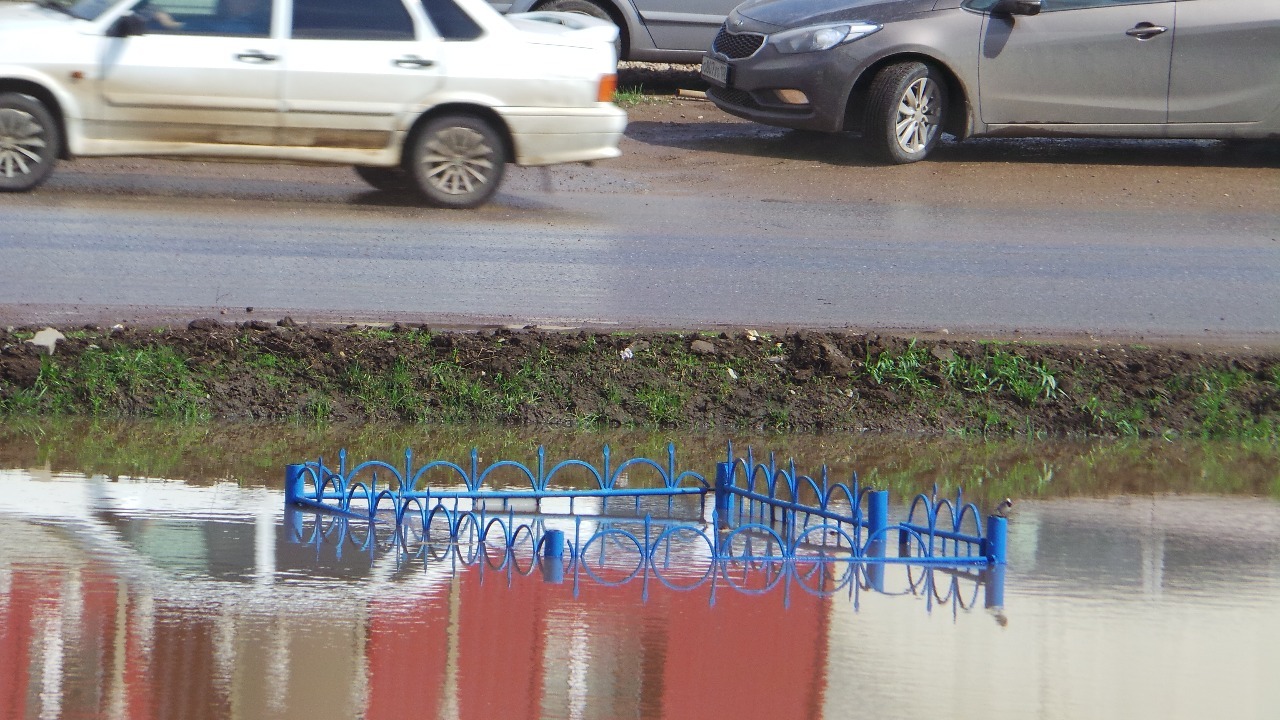 К озеру привезли землю, которая должна не допустить перелива автодороги. Об уровне воды можно судить по затопленному ограждению газовой трубы. Стоит отметить, что река с каждым днем приближается и к автодороге по улице Пугачева (не доезжая до поворота на «Ленту»).