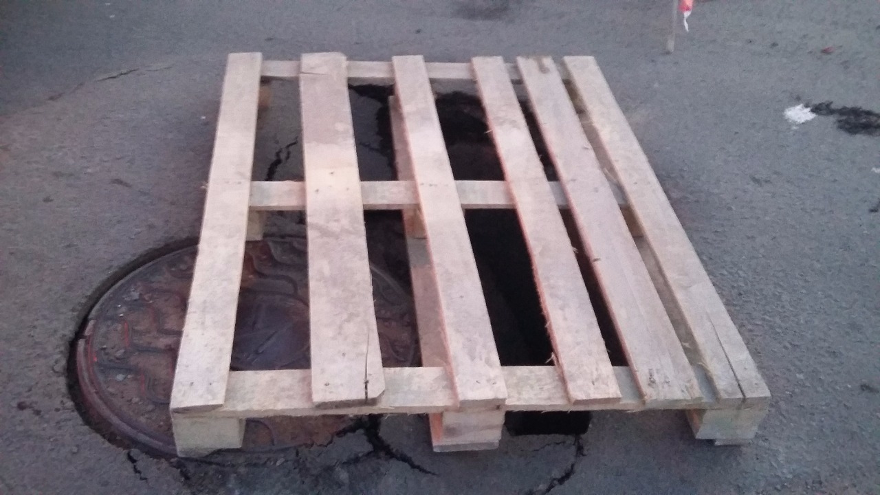 Частные охранники (судя по спецформе) прикрыли яму деревянной решеткой и огородили место обрушения сигнальной лентой. Стоит отметить, что на данной территории это не первый колодец, закрытый подобным образом.