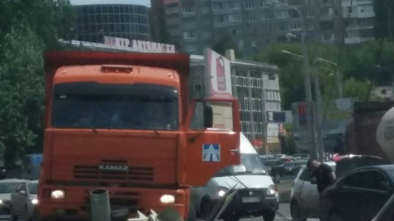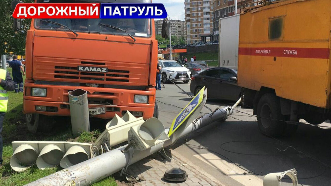 УФА, 22 июн 2017. /ИА «Башинформ», Ксения Калинина/. В Уфе спецмашина «КамАЗ» врезалась в светофорный столб. ДТП произошло днем 22 июня на улице Бакалинской. Удар был настолько сильный, что дорожная конструкция рухнула на проезжавшую мимо иномарку. По информации очевидцев, выложивших фотографии в группе