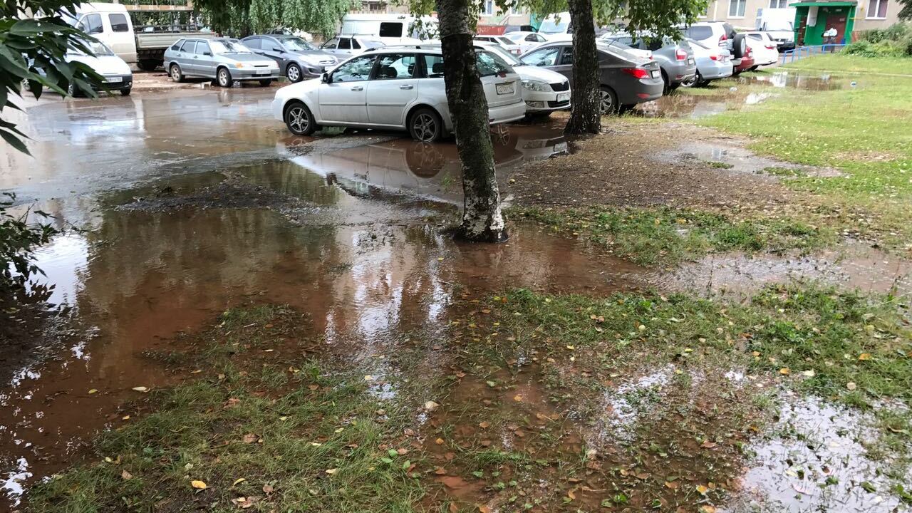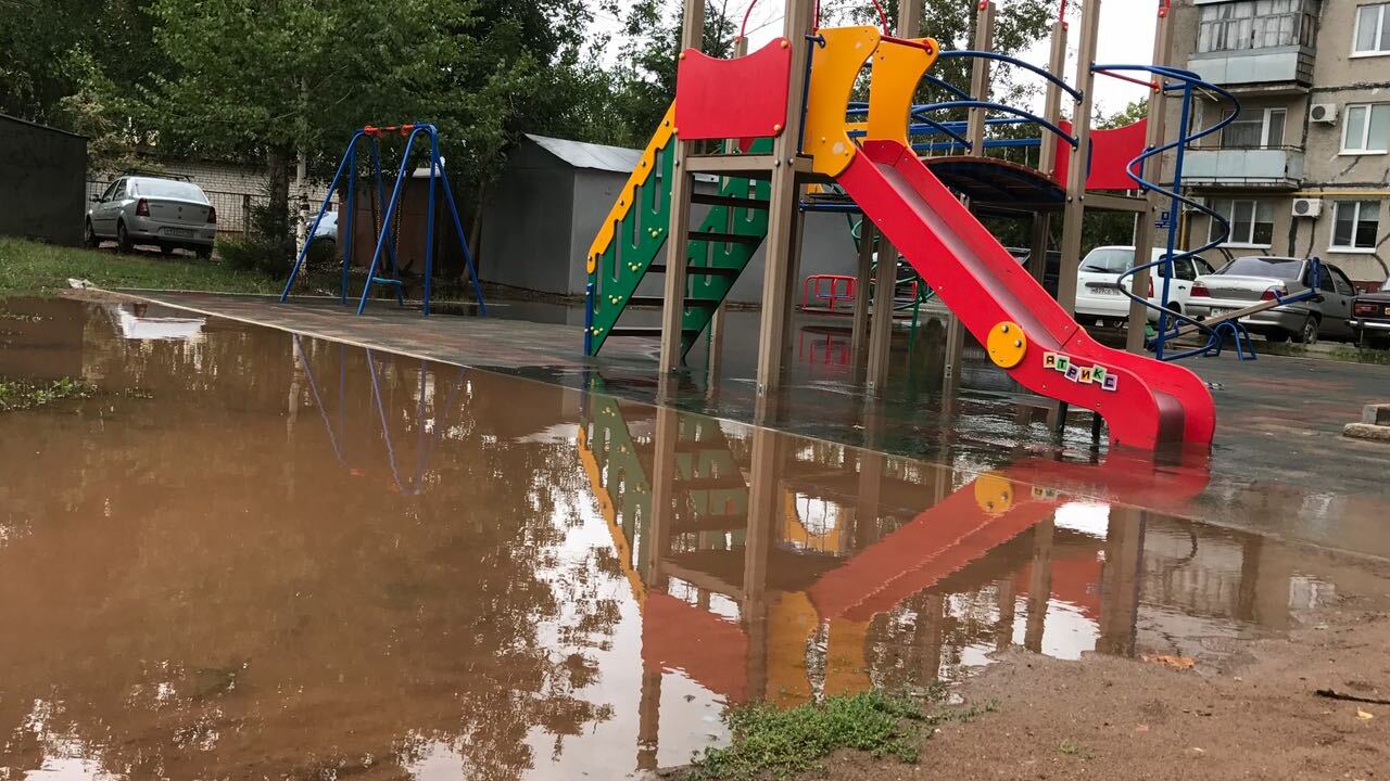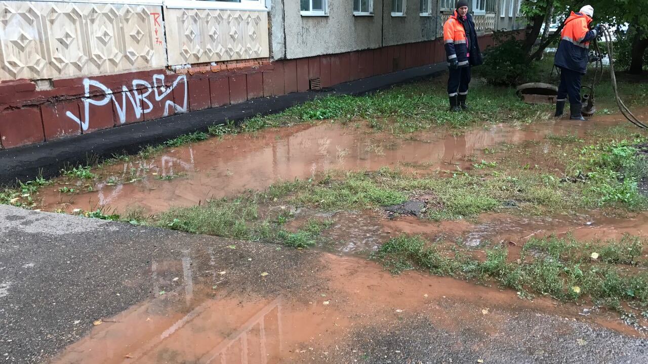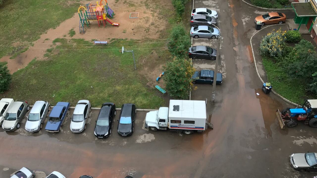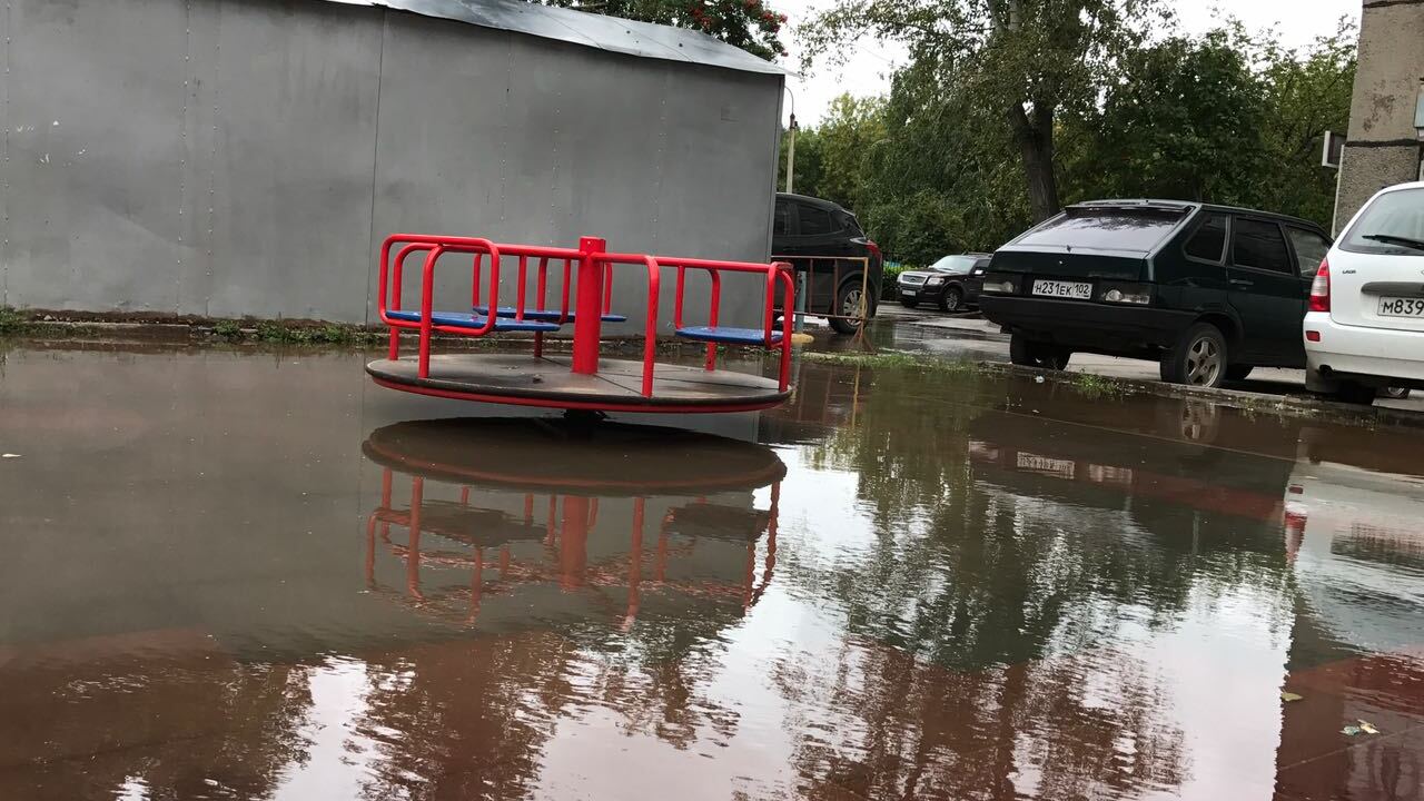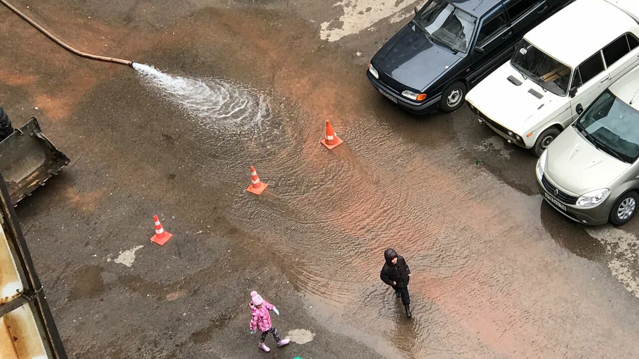 УФА, 11 сен 2017. /ИА «Башинформ», Гульфия Акулова, Ксения Калинина/.В Уфе во дворе жилых домов по улице Авроры,13/2, 11/2 и перед домом 13/1 накануне вечером появилась утечка воды. В настоящее время вода вытекает не из колодца, а из-под асфальта, она разлилась на оба двора, затопила весь газон, внутридворовую дорогу к детскому садику, детскую площадку.