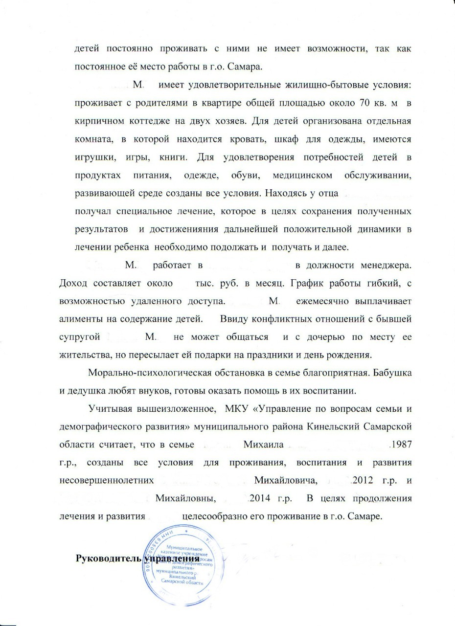 «Этого времени ничтожно мало - я не могу полноценно участвовать в воспитании и развитии детей и тем более в лечении сына», - уверен Михаил. По его мнению, в большом городе мальчик мог получить более подходящий уход, чем в селе в Башкирии. А потому отдавать сына теперь уже бывшей жене не спешил и лечил его в Самаре.