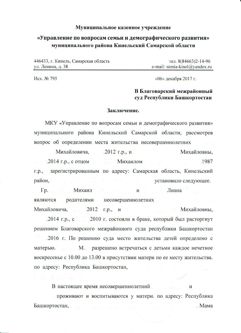 «У моего сына врожденное заболевание, - рассказывает Михаил. - Жена забрала детей в апреле 2015 года, когда мы еще не были в разводе. Следующие полгода я раз 30 ездил к ней в деревню в надежде восстановить отношения, но все безрезультатно. Я обращался в центр «Семья», его сотрудники звонили Лиане и пытались с ней поговорить, но на контакт она не шла. Когда в декабре я приехал в Башкирию, сын почти не говорил. Мы пошли гулять на улицу, я спросил у него: «Хочешь домой?». Он кивнул. Мы сели в машину и уехали в Самару».
