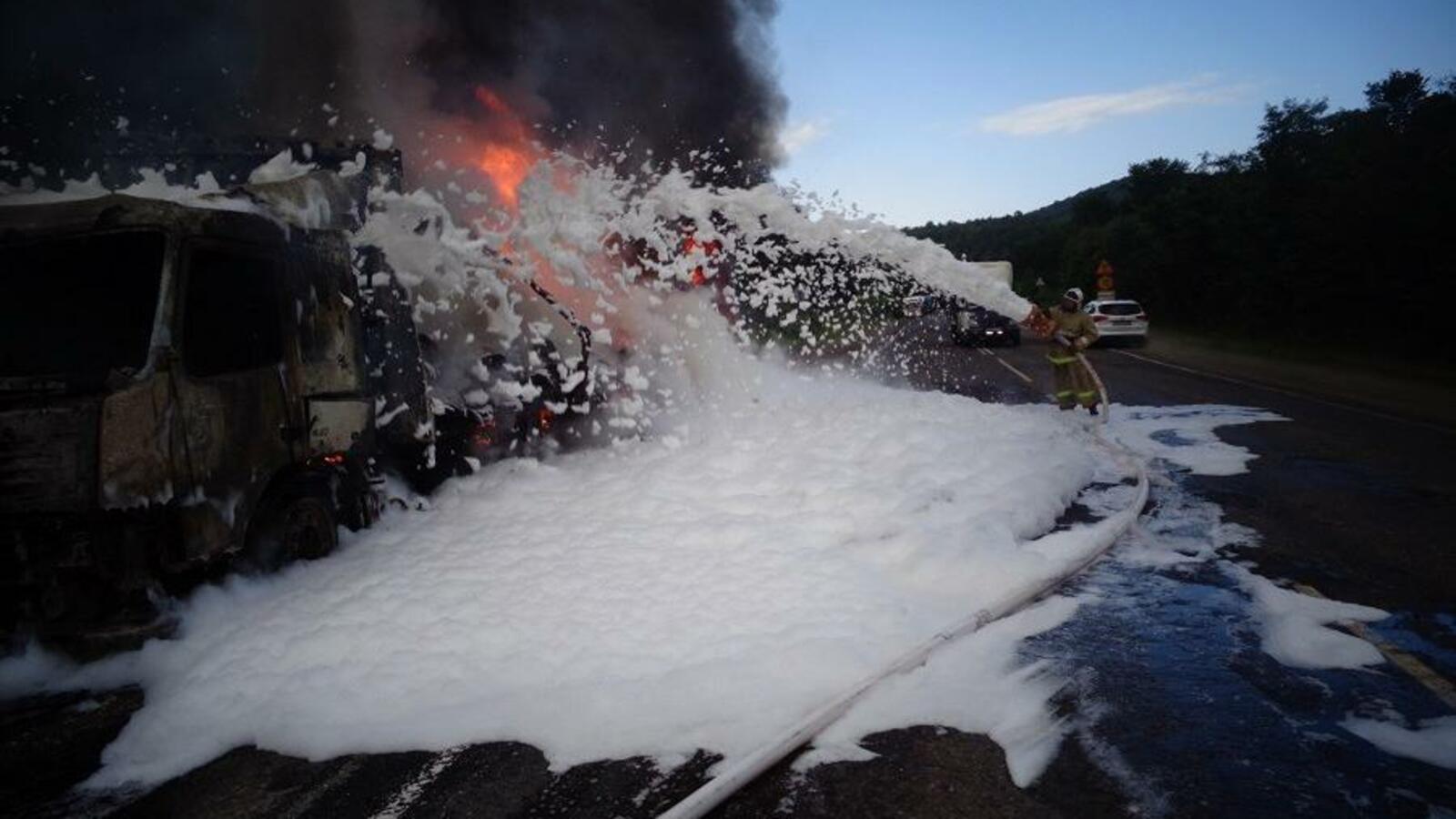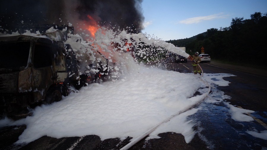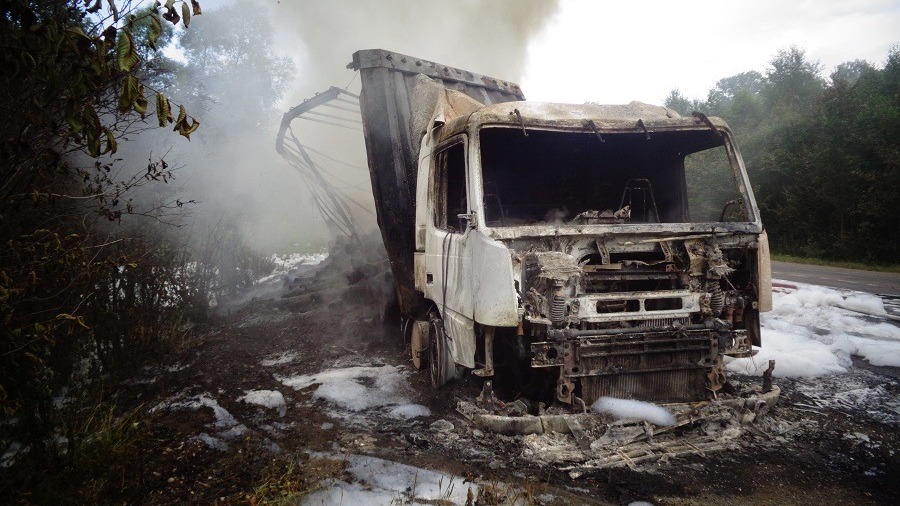 УФА, 19 июл 2019. /ИА «Башинформ», Ксения Калинина/. В Башкортостане на 105 км трассы Белорецк — Уфа 18 июля загорелась фура Volvo. Водитель успел покинуть кабину горящего грузовика. Когда пожарные подразделения прибыли к месту пожара, грузовой автомобиль, перевозивший рубероид, был объят огнем.