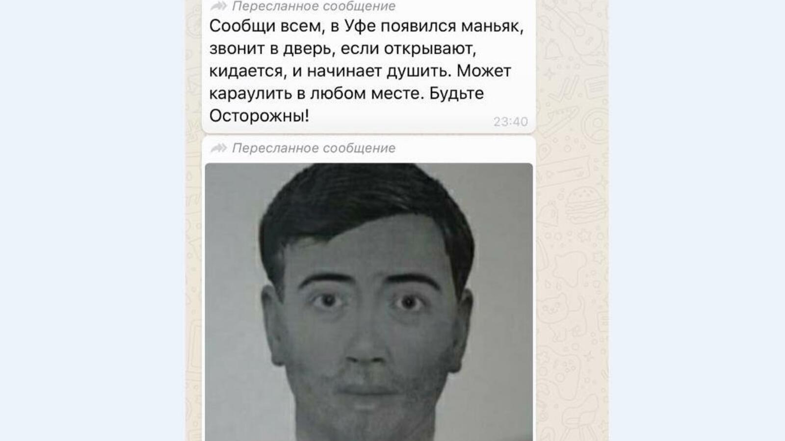 УФА, 22 окт 2019. /ИА «Башинформ»/. Среди жителей Уфы активно распространяется информация о маньяке. В родительские группы в мессенджерах отправляются сообщения с фотороботом преступника. Якобы мужчина звонит в дверь, если открывают – набрасывается на жильца и начинает его душить.