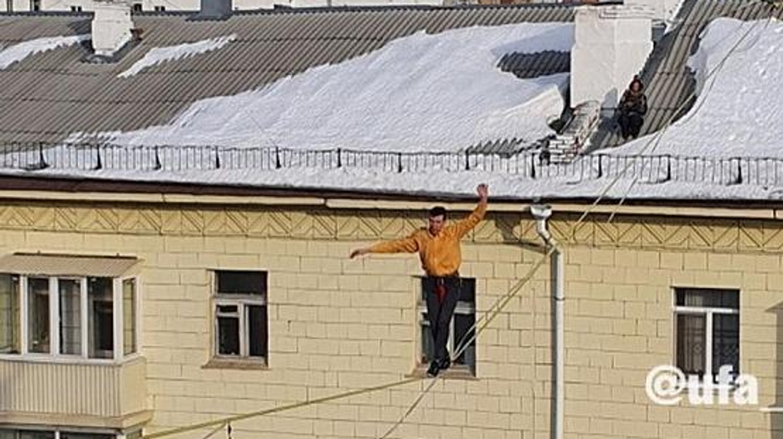 Накануне 8 Марта два уфимских экстремала решили поздравить женщин весьма опасным способом – пройдясь по канату, натянутому между крыш двух пятиэтажных домов по улице Ленина. Как видно на выложенных в соцсети фото и видеокадрах, переход проходил в условиях сильных порывов ветра. И хотя канатоходцы прикрепили себя к тросу страховкой, все могло закончиться печально, если бы элементы крыши, к которым был привязан канат, вдруг не выдержали нагрузок, на которые они не рассчитаны.