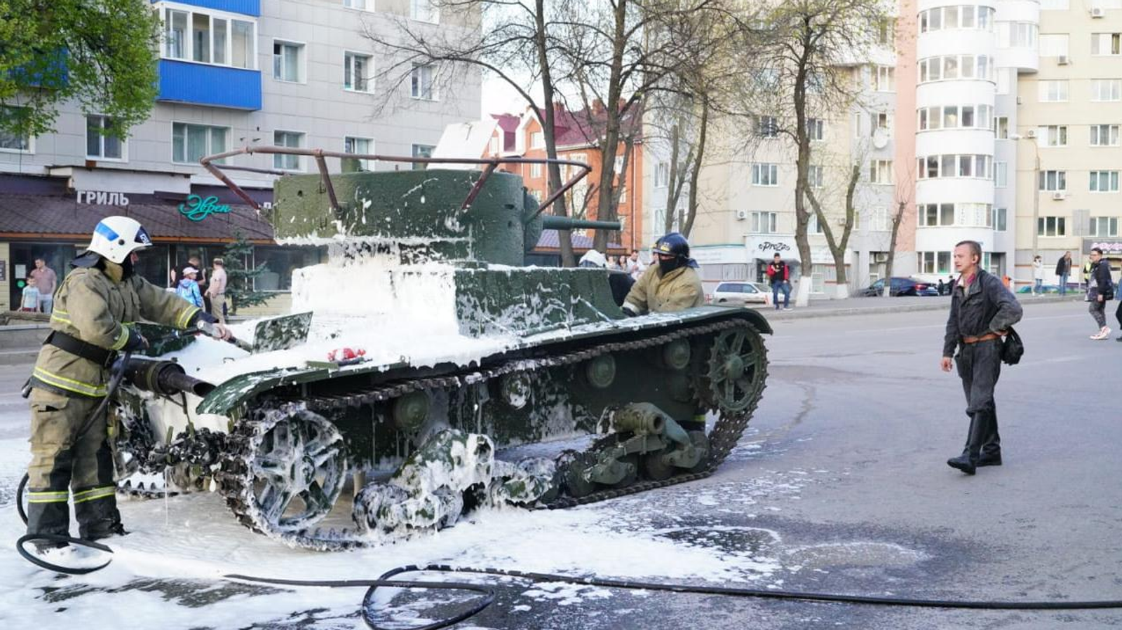 Как сообщили информационному агентству в пресс-службе регионального МЧС, на корпус танка Т-26 пролилось топливо, которое и воспламенилось. Водитель потушил огонь самостоятельно до прибытия профессиональных спасателей. Однако пожарные решили обезопасить технику — пролить и смыть топливо.