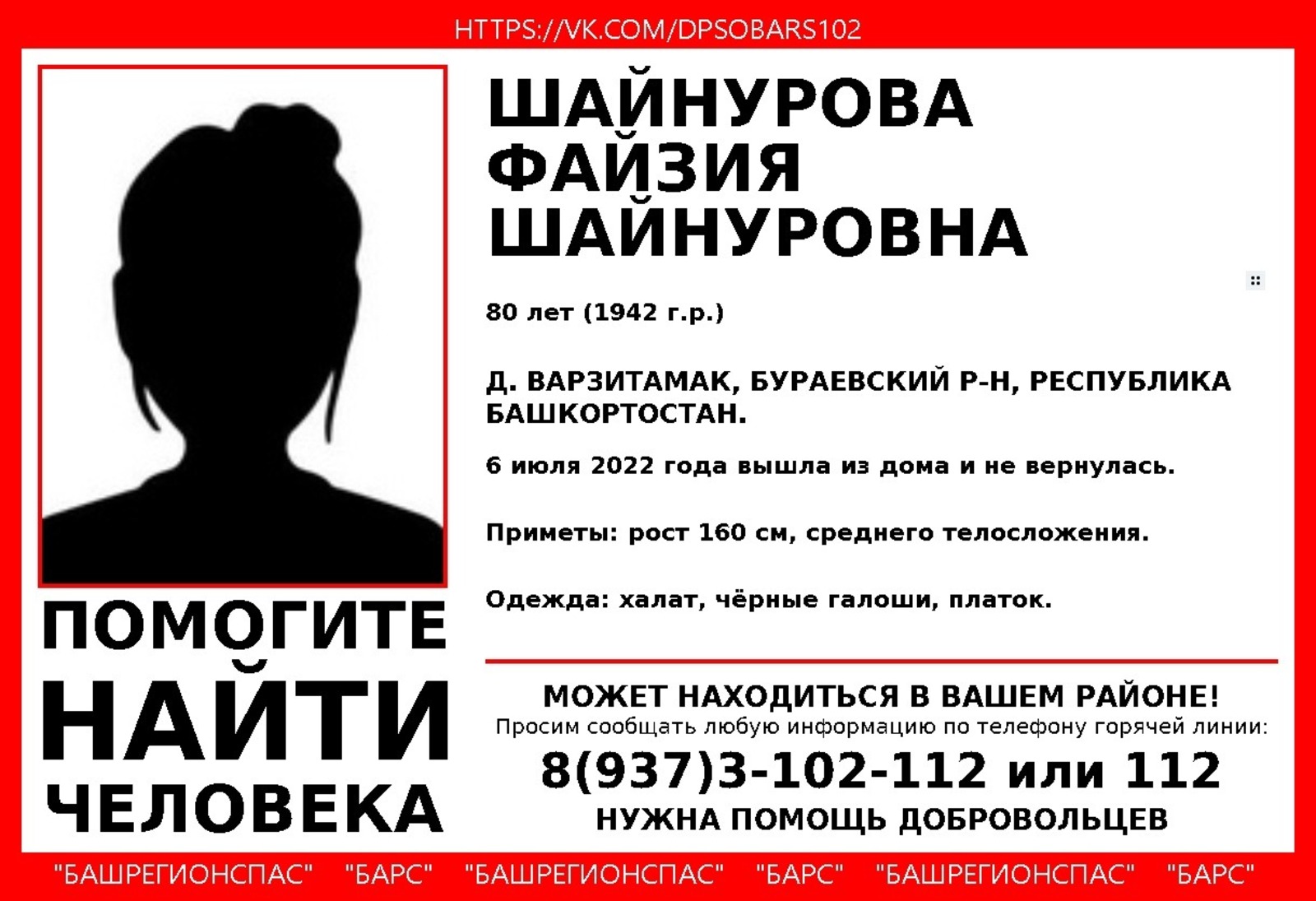Всех, кто обладает какой-либо информацией о местонахождении пропавшей, просят сообщить волонтерам группы «БашРегионСпас» по телефону: 8-937-3-102-112 или в Службу-12.
