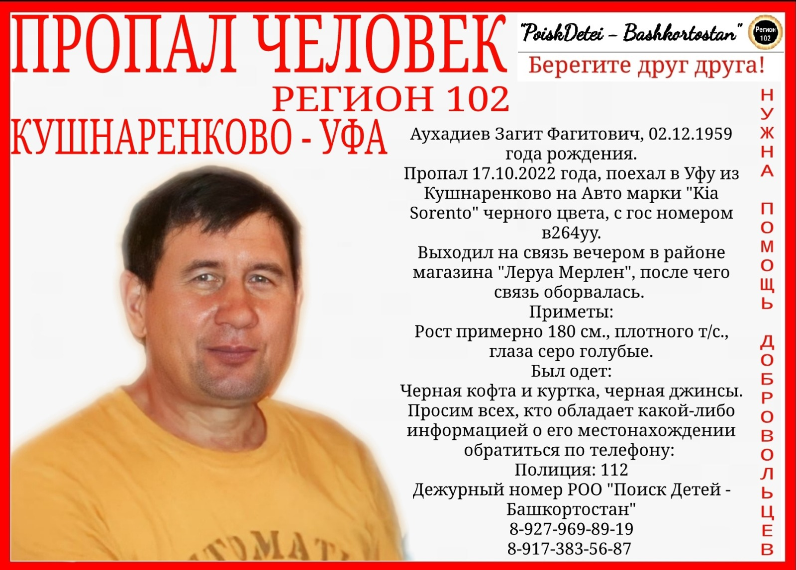 В Башкирии разыскивается пропавший без вести 62-летний Загит Аухадиев. В группе волонтеров «Поиск детей — Башкортостан» 18 октября появилось сообщение о том, что мужчина 17 октября поехал в Уфу из Кушнаренково на автомобиле марки Kia Sorento черного цвета.