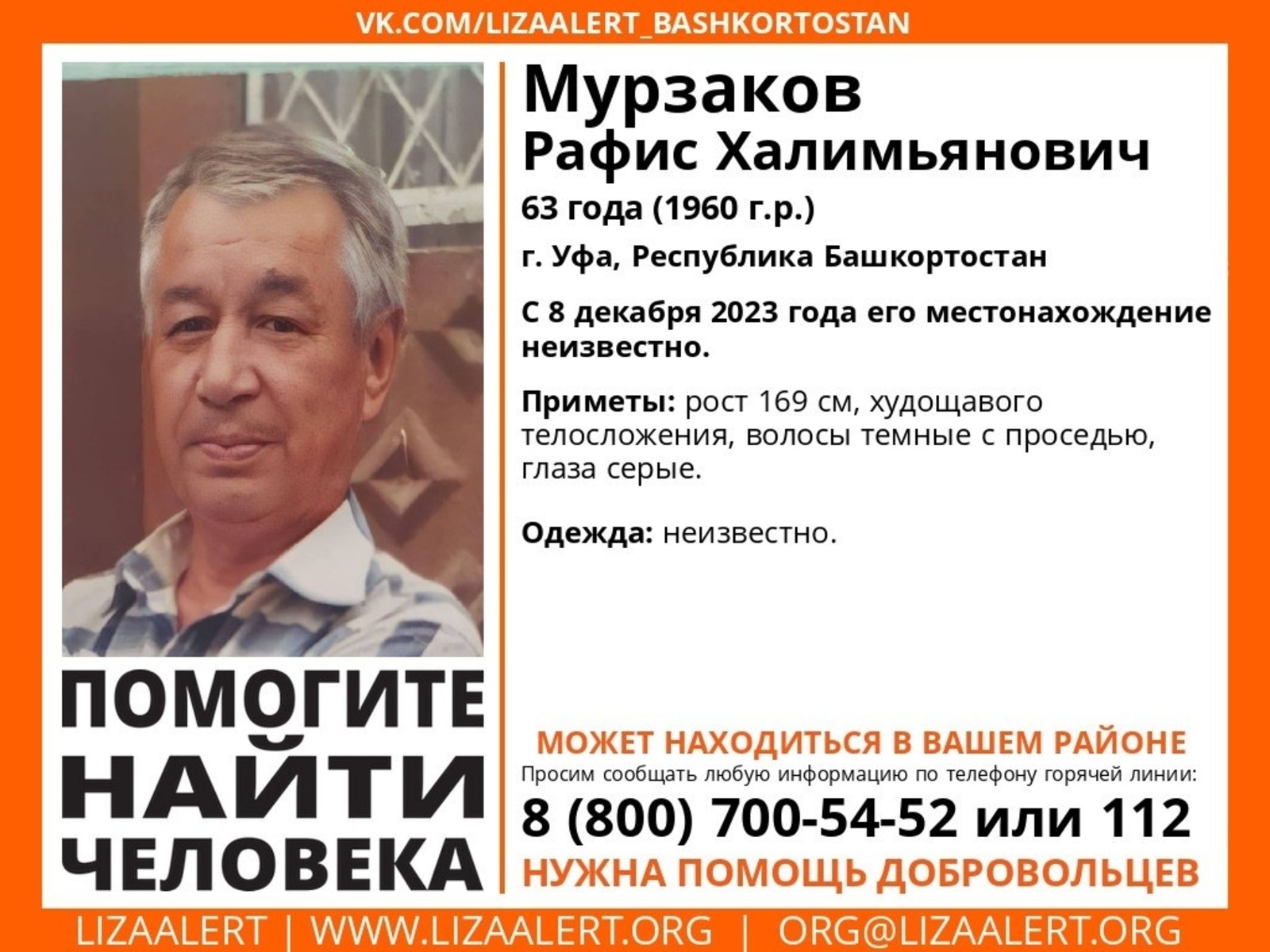 В Уфе пропал 63-летний Мурзаков Рафис Халимьянович (1960 года рождения). С 8 декабря 2023 года его местонахождение неизвестно, сообщает поисковый отряд «Лиза Алерт Башкортостан».