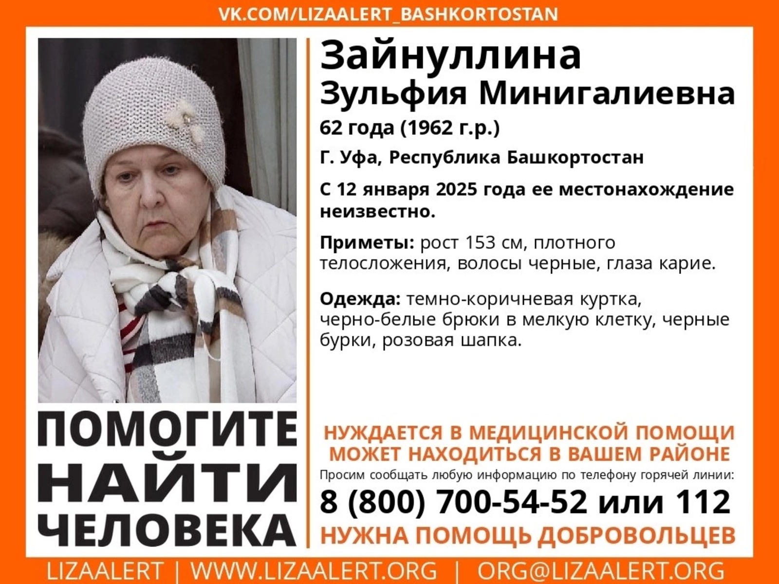 В Уфе разыскивается пропавшая 62-летняя Зайнуллина Зульфия Минигалиевна. С 12 января 2024 года ее местонахождение неизвестно, сообщает поисковый отряд Лиза Алерт Башкортостан.