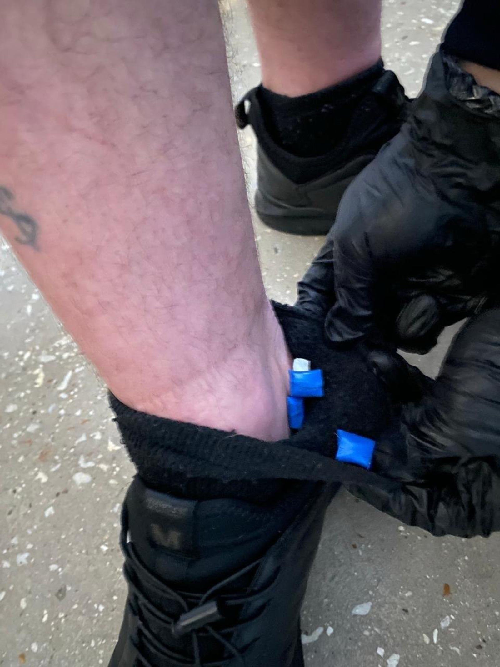 При личном досмотре у мужчин изъято более четырёх граммов синтетических наркотиков. Они прятали их в носках и в пачке сигарет с ироничной надписью «мучительная смерть».