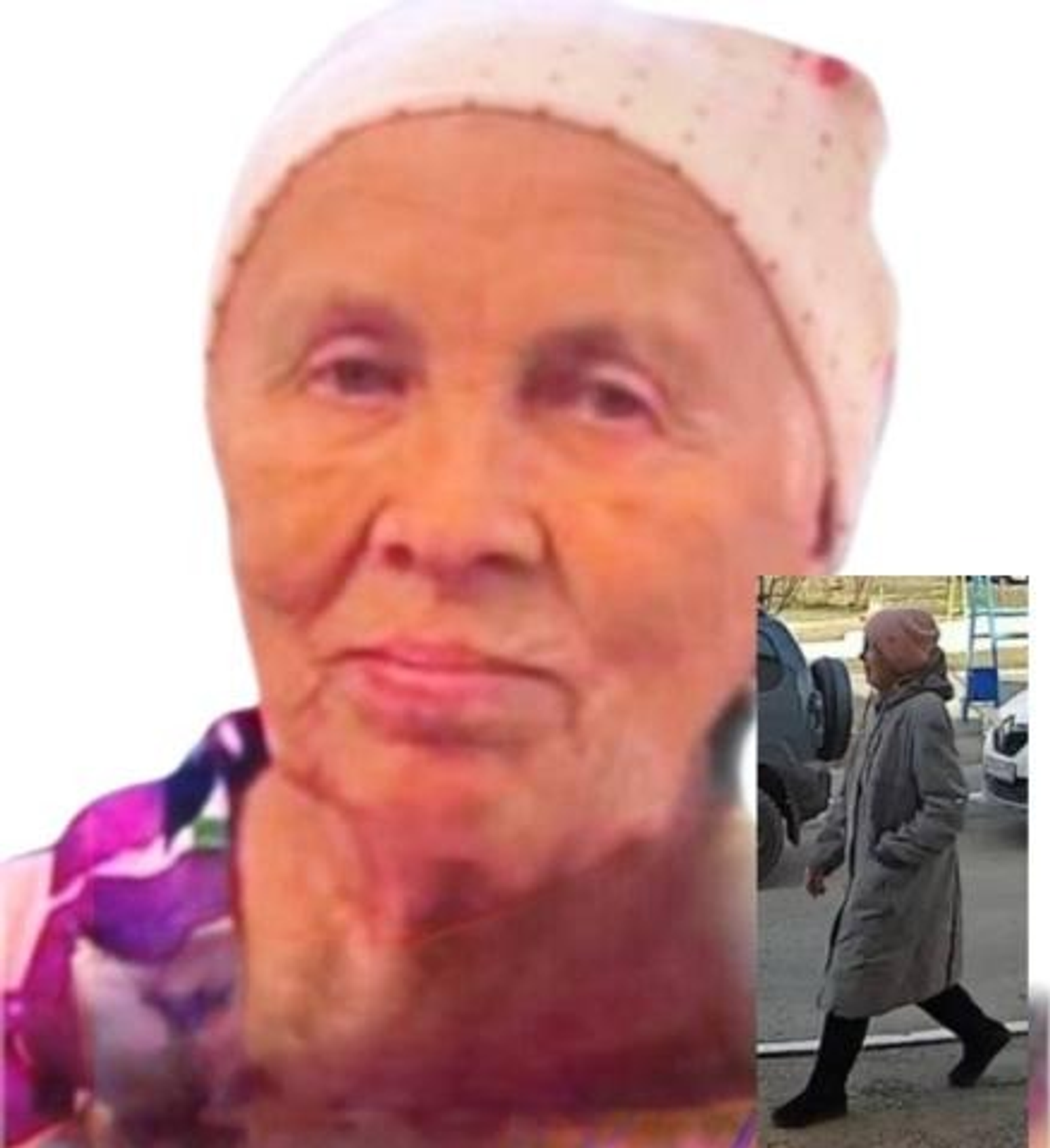 Приметы: рост 165 см, худощавого телосложения, волосы седые, глаза светло-голубые. Была одета: серый плащ, бирюзовый халат, чёрные кожаные сапоги, розовая шапка.