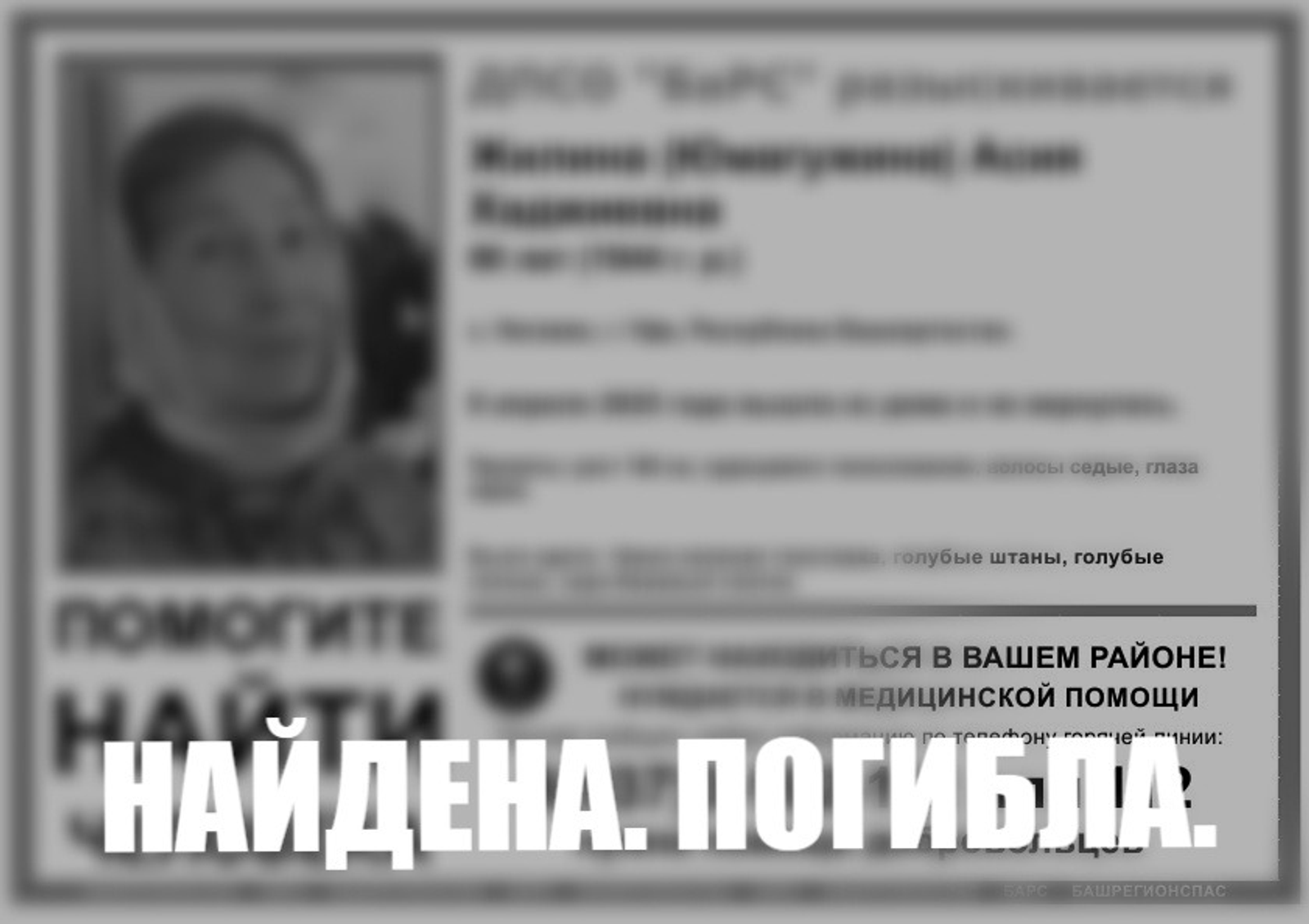 Поиски пропавшей 80-летней Асии Ж. закончились трагедией. Как сообщили сегодня добровольцы поискового отряда «Башрегионспас», женщину нашли мертвой.