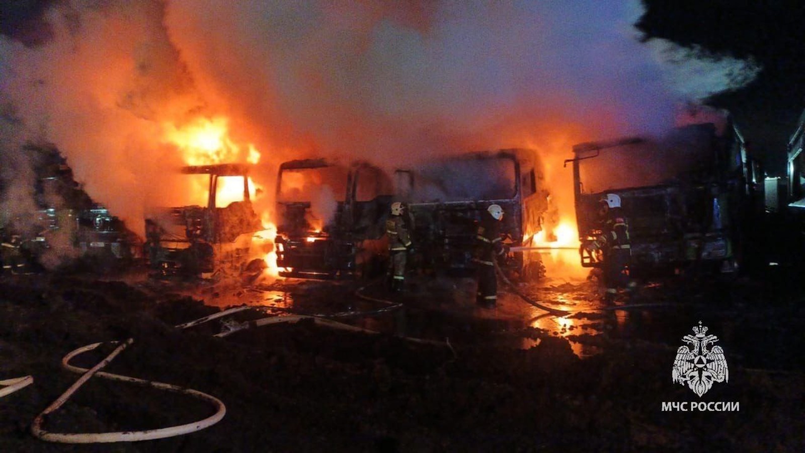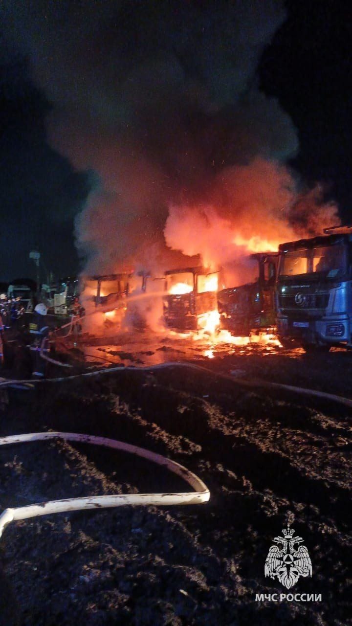 В селе Федоровка Калининского района ночью сгорели шесть грузовиков. Пламя охватило кабины грузовых авто «Шакман», которые стояли вплотную друг к другу.