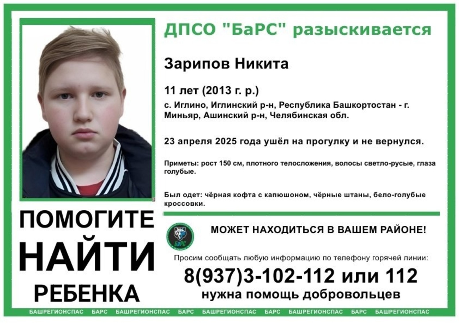 В Башкирии пропал 11-летний Никита Зарипов (2013 года рождения).