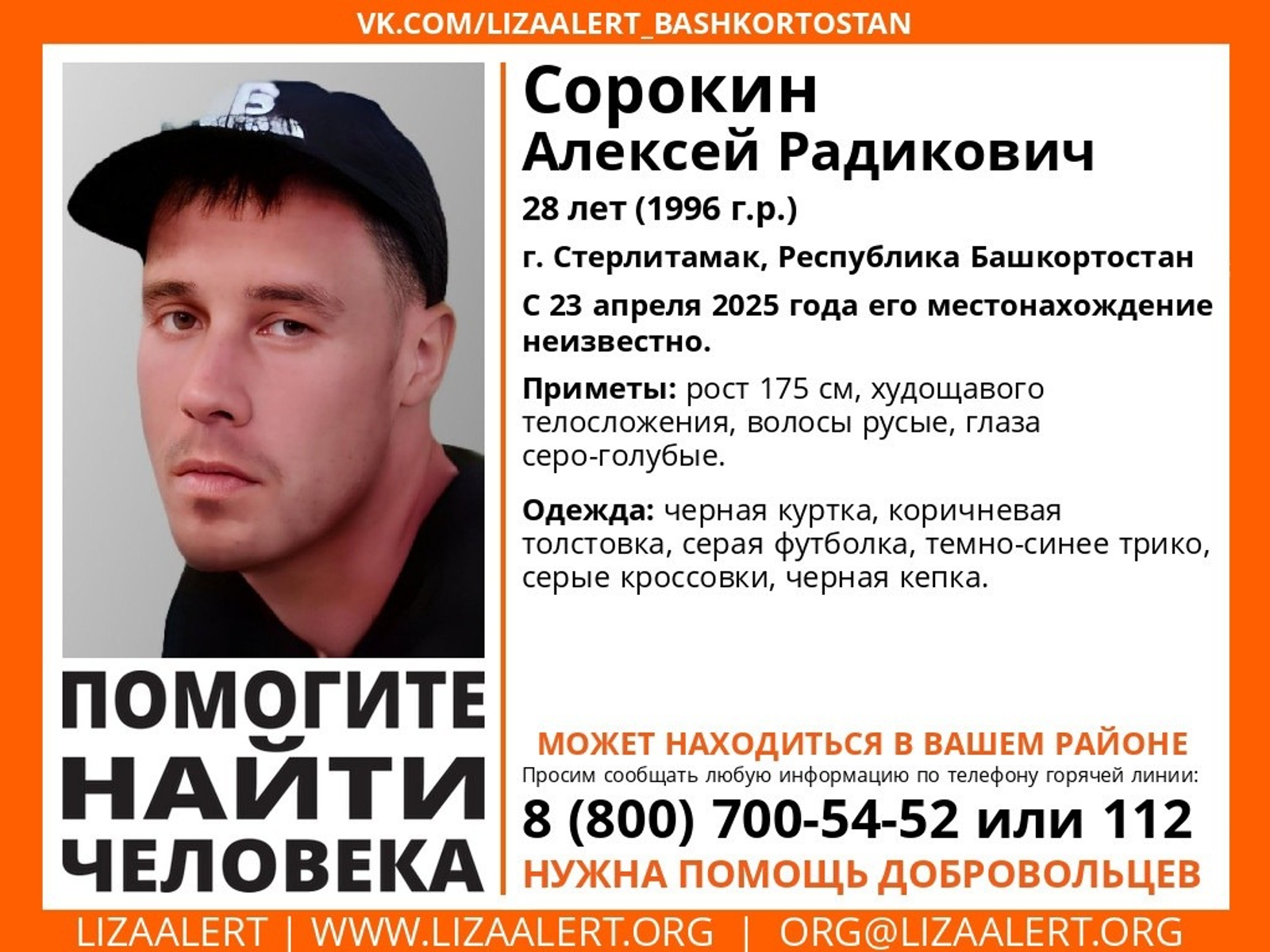 Житель Стерлитамака Алексей Сорокин пропал без вести 23 апреля, передает "Лиза Алерт РБ".