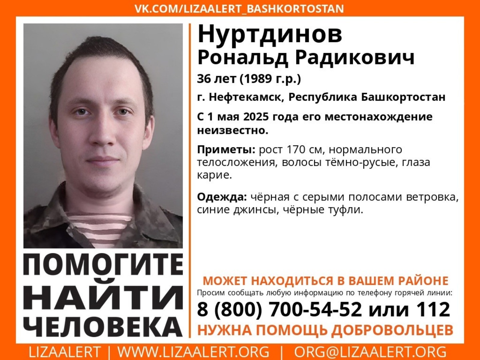 Поиски 36-летнего Роберта Нуртдинова из Нефтекамска ведутся в Башкирии с 1 мая. По данным «Лиза Алерт РБ», мужчина был одет в черную ветровку с серыми полосками, синие джинсы и черные туфли.