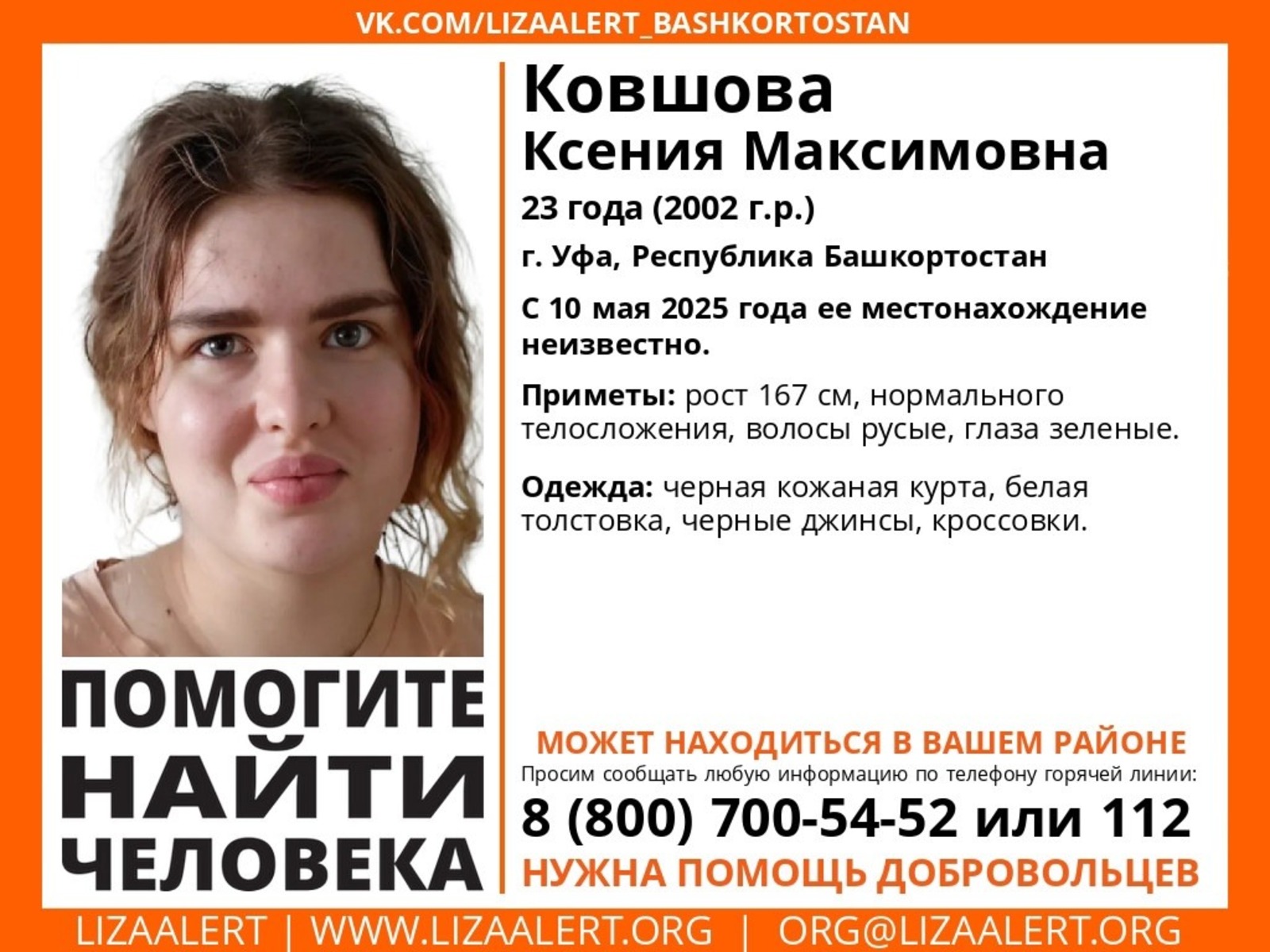 Сегодня, 10 мая, пропала жительница Уфы Ксения Максимовна Ковшова. Поиски ведёт «Лиза Алерт РБ».