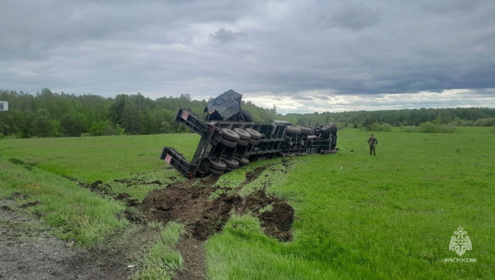 Как сообщается в соцсетях, опрокинувшийся в кювет грузовик вез трофейную технику НАТО, которую выставляли на площади Ленина в Уфе.