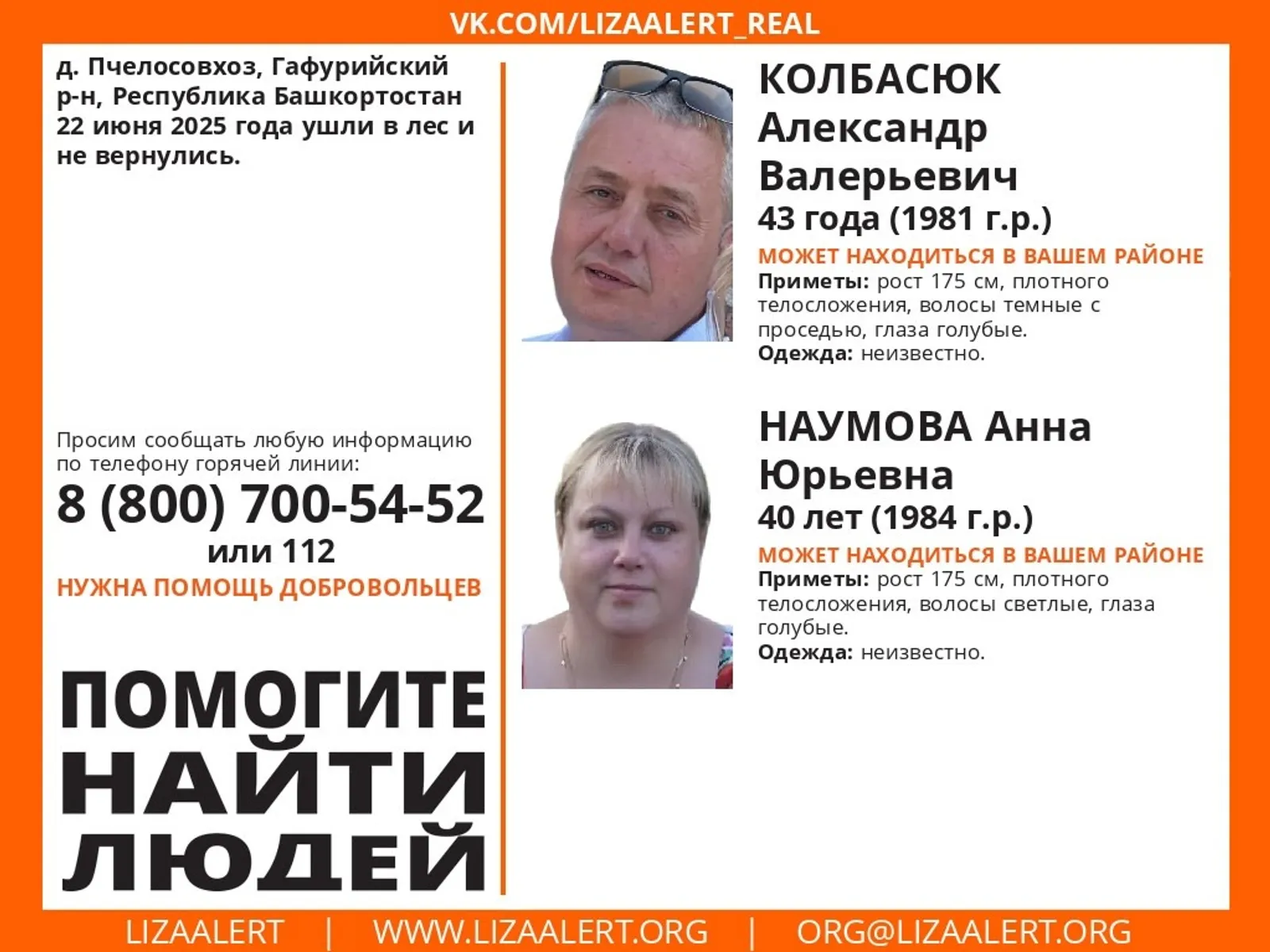 43-летний Александр Колбасюк и 40-летняя Анна Наумова из деревни Пчелосовхоз Гафурийского района ушли 22 июня в лес и домой не вернулись. Об этом сообщили волонтеры поискового отряда «ЛизаАлерт».