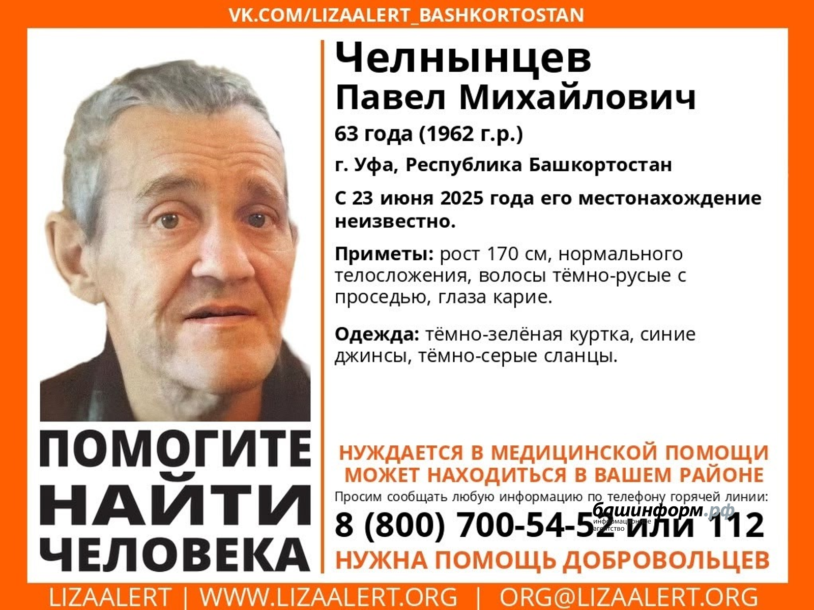63-летний Павел Челнынцев пропал в Уфе. Как сообщили волонтеры поискового отряда «ЛизаАлерт», он нуждается в медпомощи.
