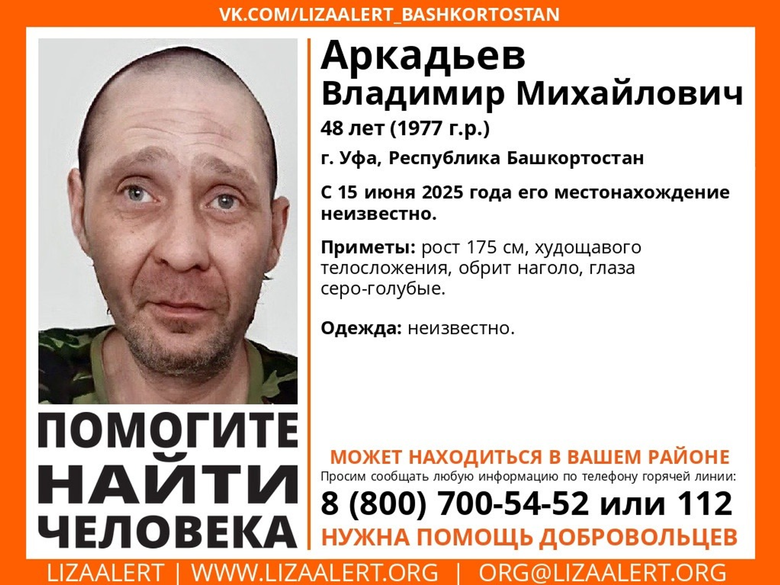 Уфимец Владимир Аркадьев пропал без вести в Башкирии 15 июня, сообщает «Лиза Алерт РБ». По данным волонтеров, 48-летний мужчина — худощавого телосложения, цвет глаз — серо-голубой, его рост — 175 см.