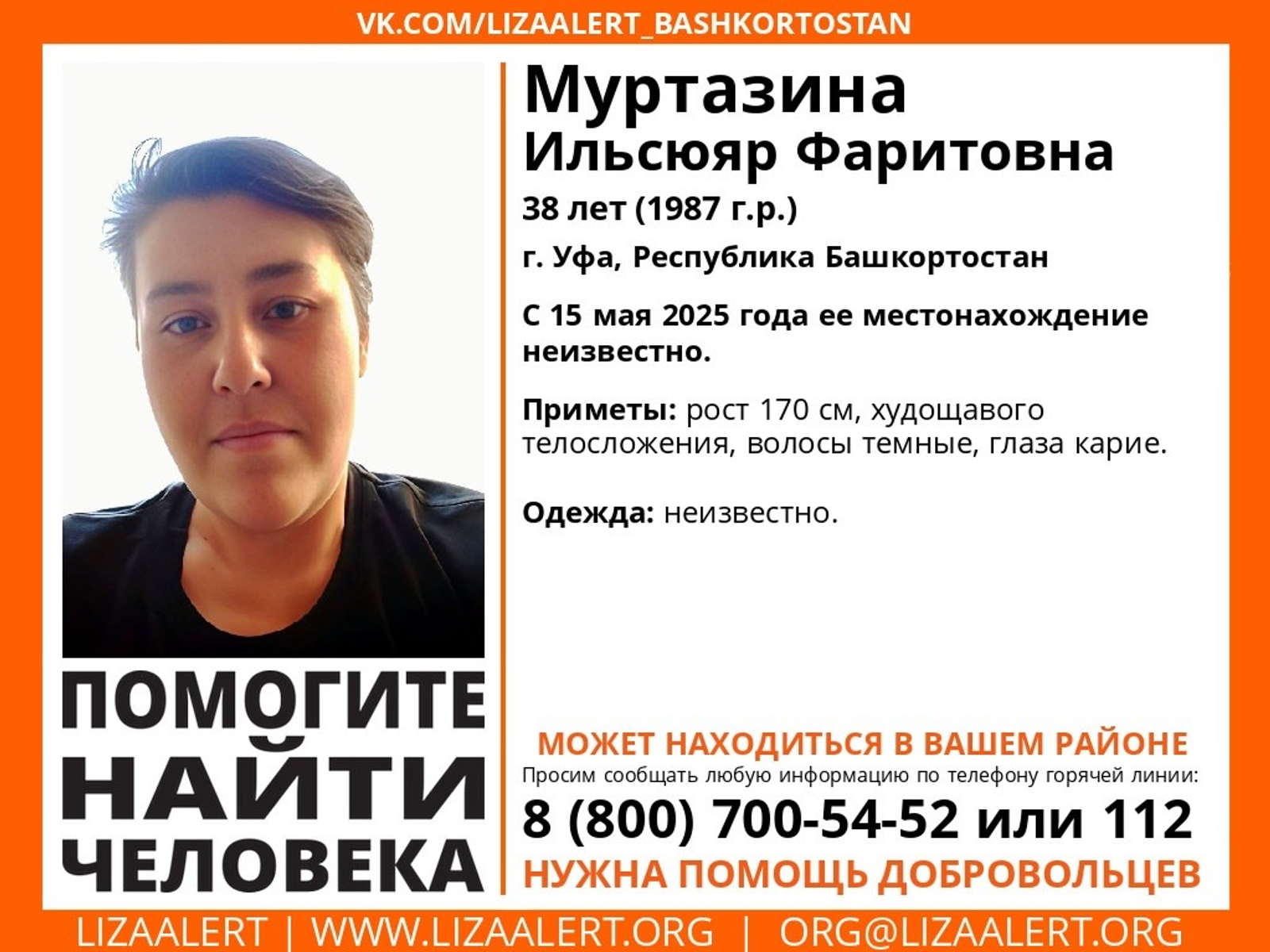 Поиски 38-летней Ильсюяр Муртазиной из Уфы ведут волонтеры «Лиза Алерт РБ». Известно, что женщина пропала без вести 15 мая 2025 года.