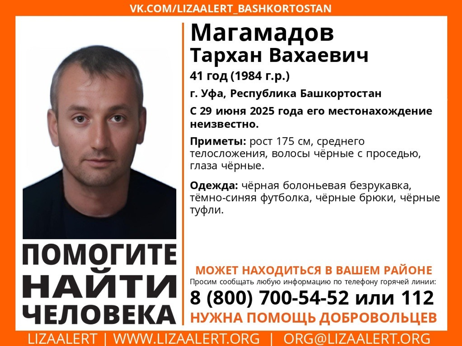 Житель Уфы Тархан Магамадов пропал без вести в Башкирии 29 июня, передает «Лиза Алерт РБ». По данным волонтеров, 41-летний мужчина был одет в черную болоньевую безрукавку, темно-синюю футболку, черные брюки и туфли.