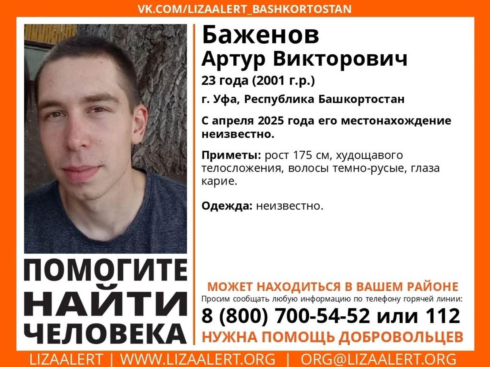 С апреля 2025 года его местонахождение неизвестно, сообщают волонтеры поискового отряда «Лиза Алерт Башкортостан».