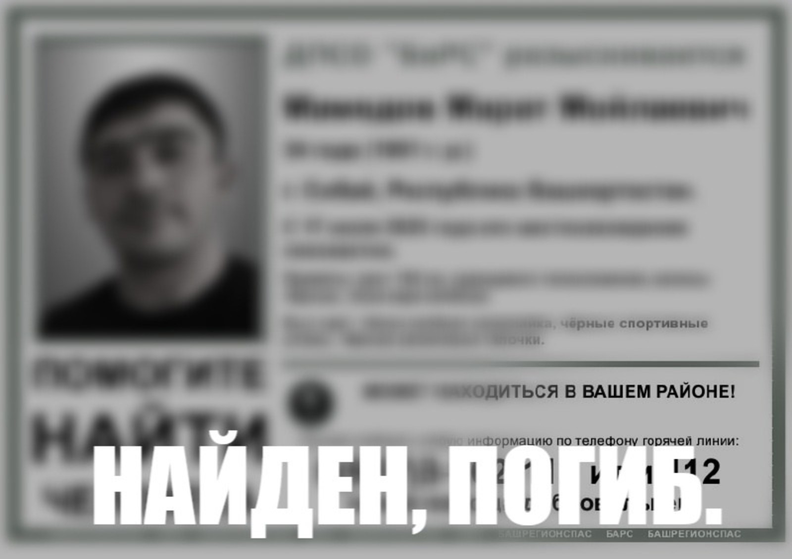 «Найден, погиб», — сообщили в аккаунте поискового отряда ДПСО «БаРС».