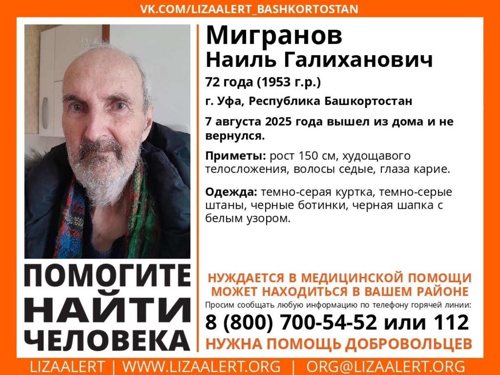 Поиски пожилого уфимца Наиля Мигранова ведут волонтеры «Лиза Алерт РБ» с 7 августа. Известно, что 72-летний горожанин был одет в темно-серые куртку и штаны, черные ботинки и шапку с белым узором.