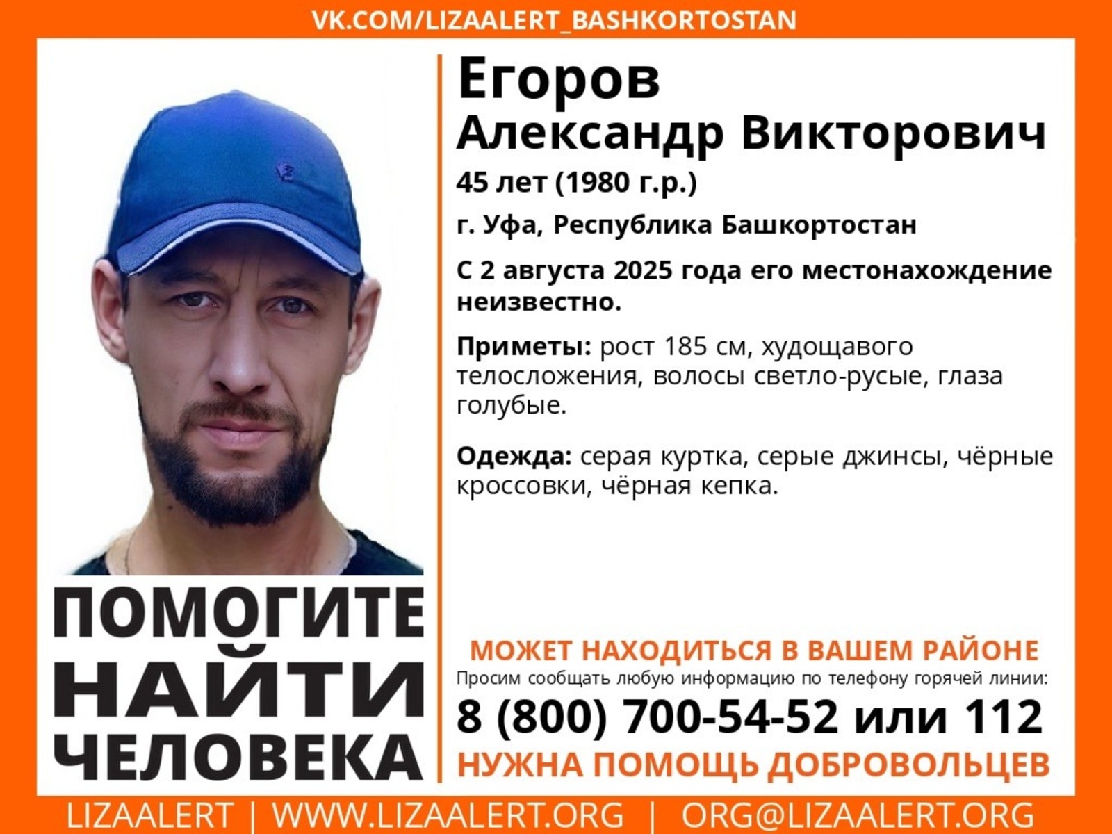 По данным волонтеров, 45-летний мужчина был одет в куртку и джинсы серого цвета, черные кроссовки и кепку. Особые приметы — рост 185 см, худощавое телосложение, светло-русые волосы и голубые глаза.