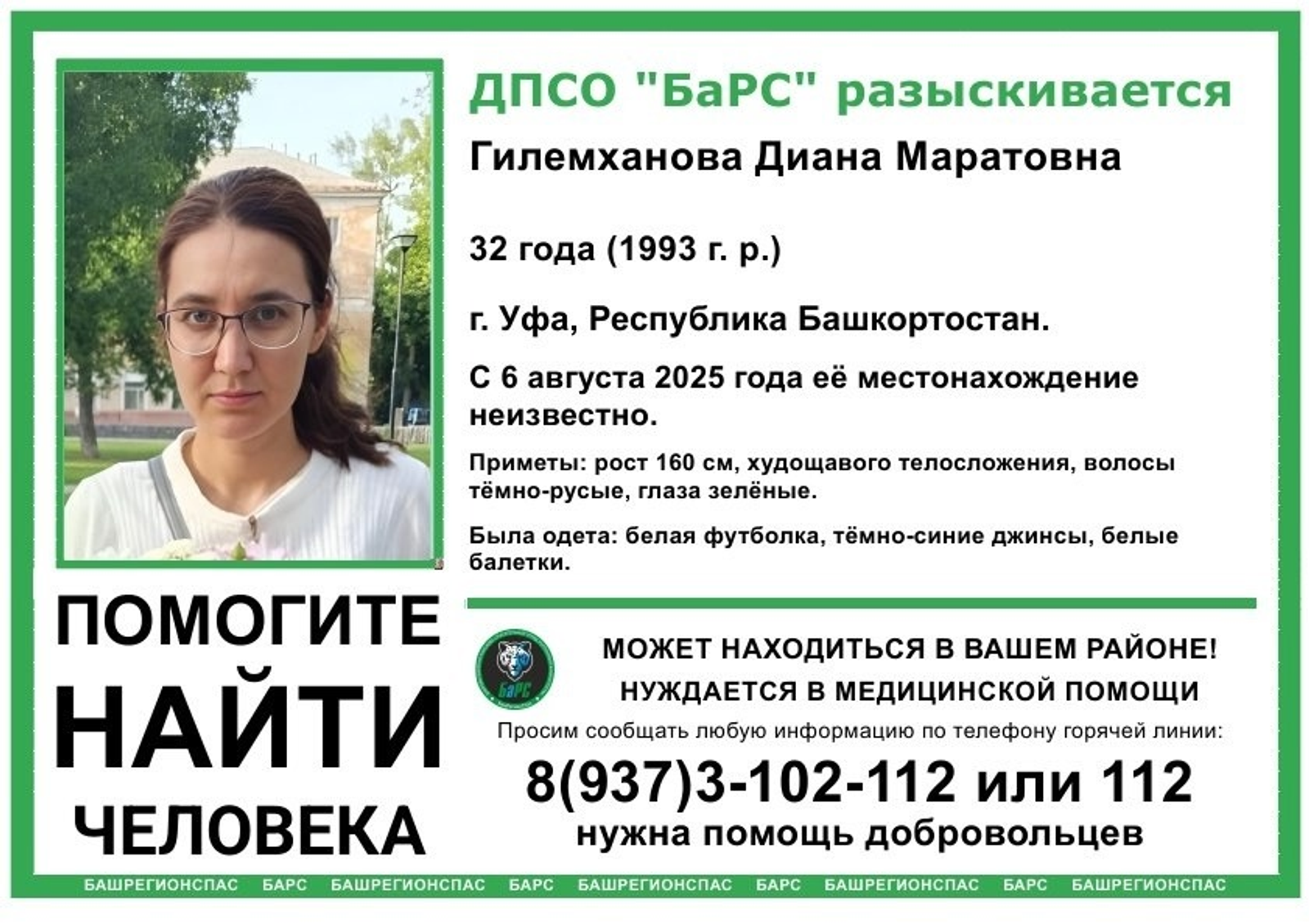 Другие приметы исчезнувшей — рост 160 см, худощавое телосложение, темно-русые волосы, зеленые глаза.