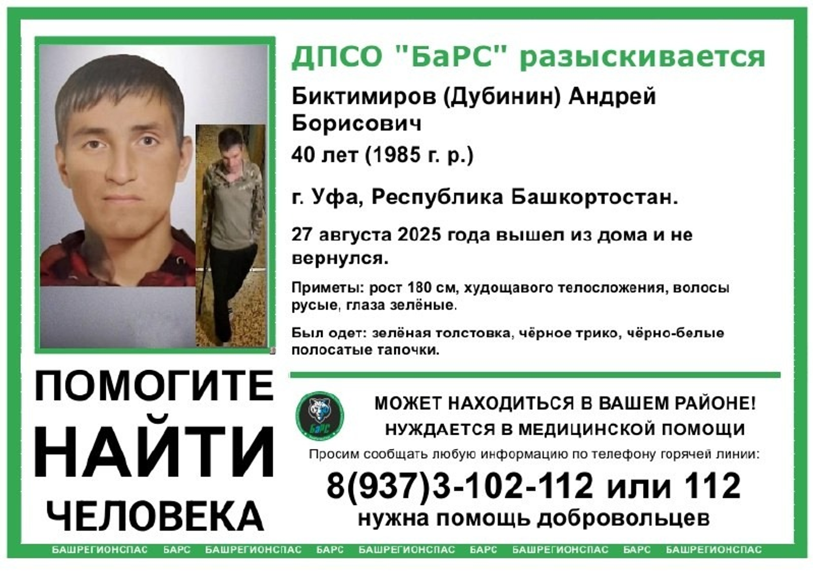 27 августа 2025 года вышел из дома и не вернулся, сообщают волонтеры поискового отряда ДПСО «Барс».