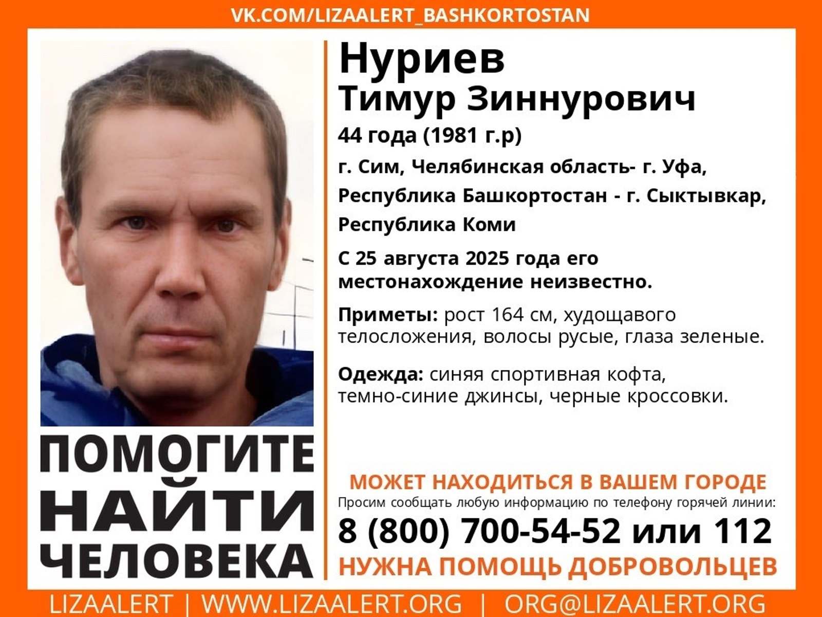Тимур Нуриев из Уфы (по другим данным — из города Сима Челябинской области и Сыктывкара Республики Коми) пропал без вести в Башкирии с 25 августа. Об этом рассказали волонтеры «Лиза Алерт РБ».