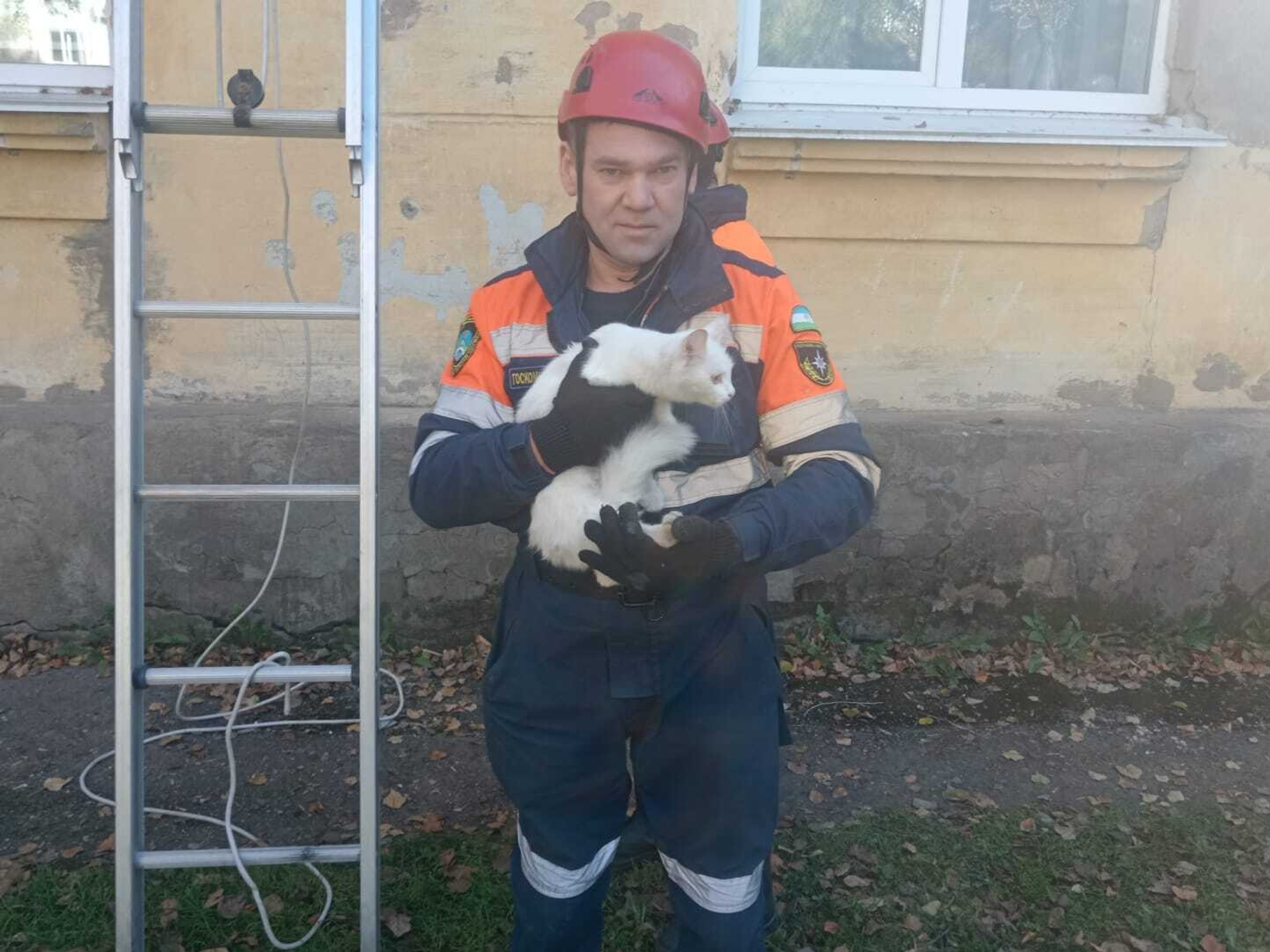 С помощью лестницы они спустили пушистую красавицу на землю и передали ее в надежные руки. Кошка не пострадала, сообщает пресс-служба ведомства.
