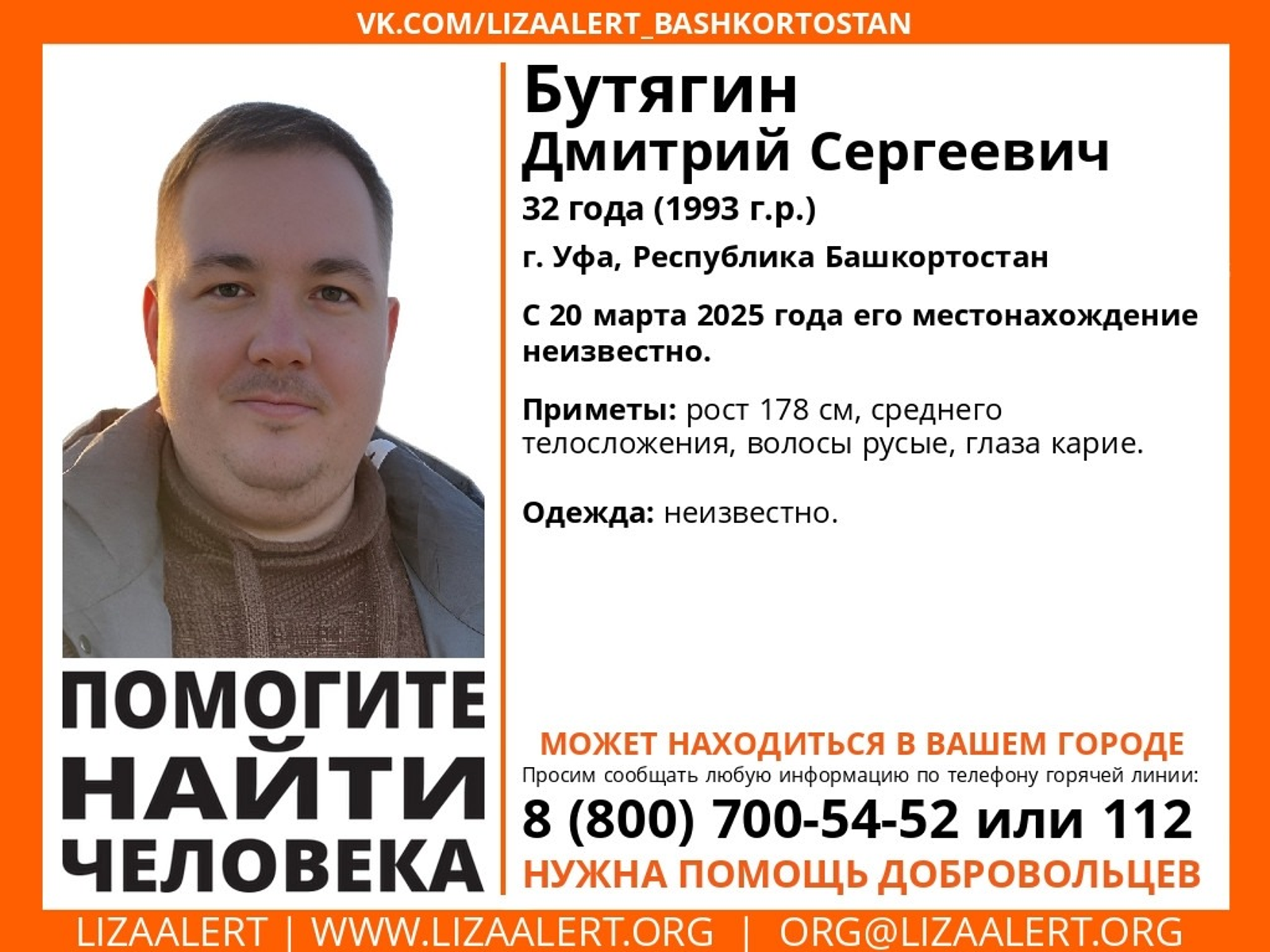 Поиски жителя Уфы Дмитрия Бутягина ведутся с 20 марта 2025 года, информирует отряд «Лиза Алерт» в Башкирии.