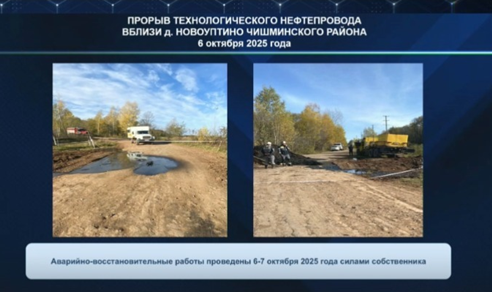 По его словам, сообщение о прорыве на технологическом нефтепроводе вблизи деревни Новоуптино Чишминского района поступило 6 октября в систему 112. В результате произошел разлив нефтесодержащей жидкости на площади 35 кв. метров.