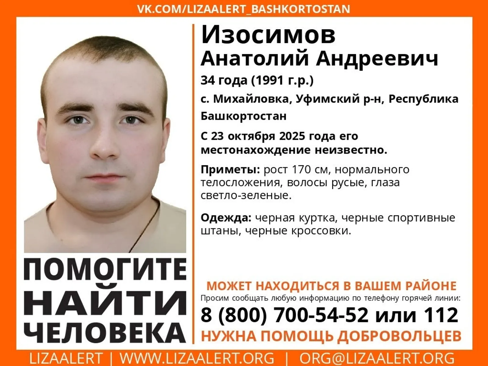 По данным волонтеров, 34-летний мужчина из Уфимского района был одет в черные куртку, спортивные штаны и кроссовки. Особые приметы исчезнувшего — рост 170 см, русые волосы, светло-зеленые глаза.