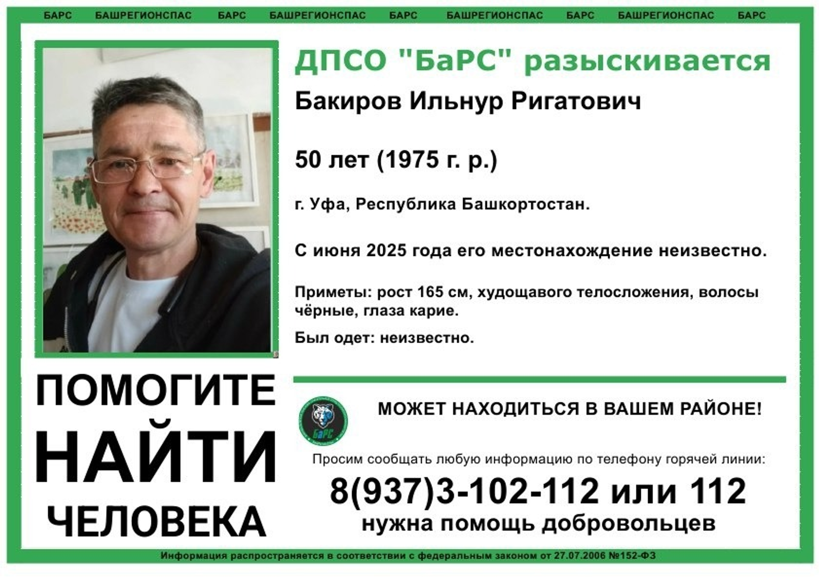 Ильнур Бакиров из Уфы пропал без вести в июне 2025 года, информирует ДПСО «БаРС». Приметы 50-летнего жителя — рост 165 см, худощавое телосложение, черные волосы, карие глаза.