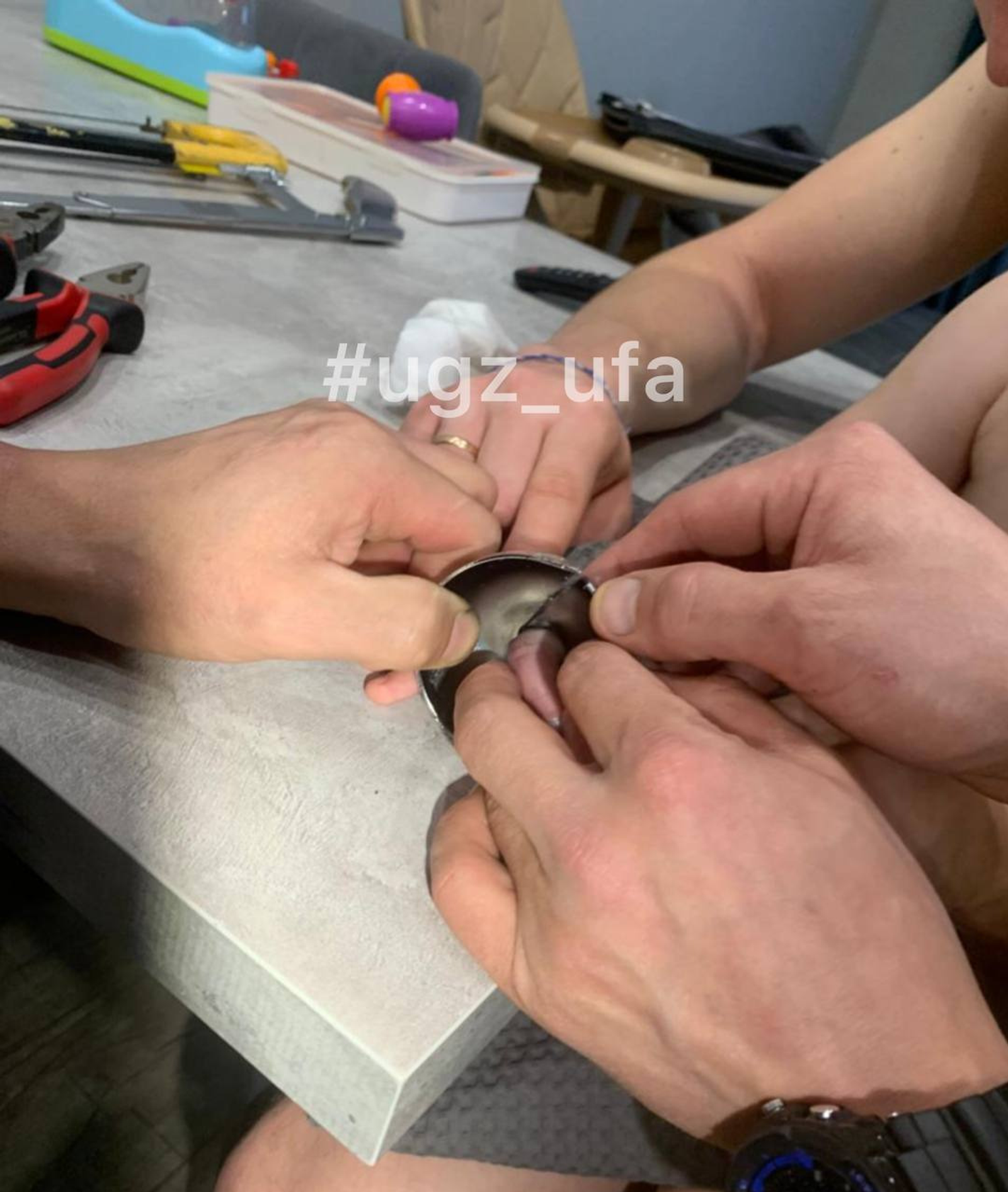 Спасатели аккуратно распилили звонок ножовкой и разогнули его, после чего освободили палец. Пострадавший палец обработали на месте, серьёзных повреждений нет.