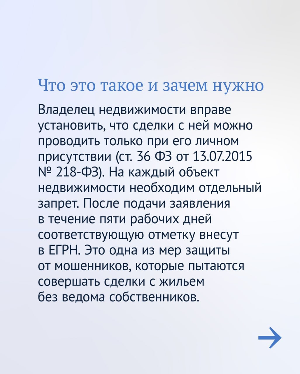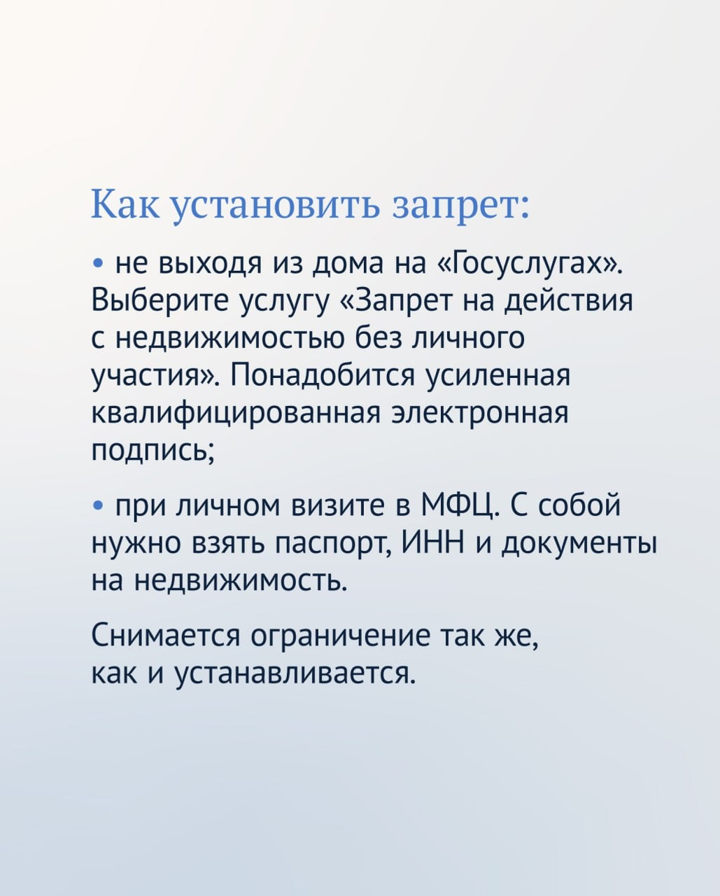 Пресс-служба законодателей подготовила карточки с инструкцией, как можно установить запрет на сделки со своей недвижимостью без личного присутствия. Это дополнительно обезопасит от действий мошенников — бывали случаи, когда они делали доверенности и продавали жильё якобы от имени владельцев, или же запутывали жертв, подталкивая их в продаже. Ранее правоохранители рассказывали, как личное присутствие владелицы квартиры на сделке помогло сотрудницам Росреестра понять, что она находится под воздействием. А другой потерпевший лишился и квартиры, и машины.