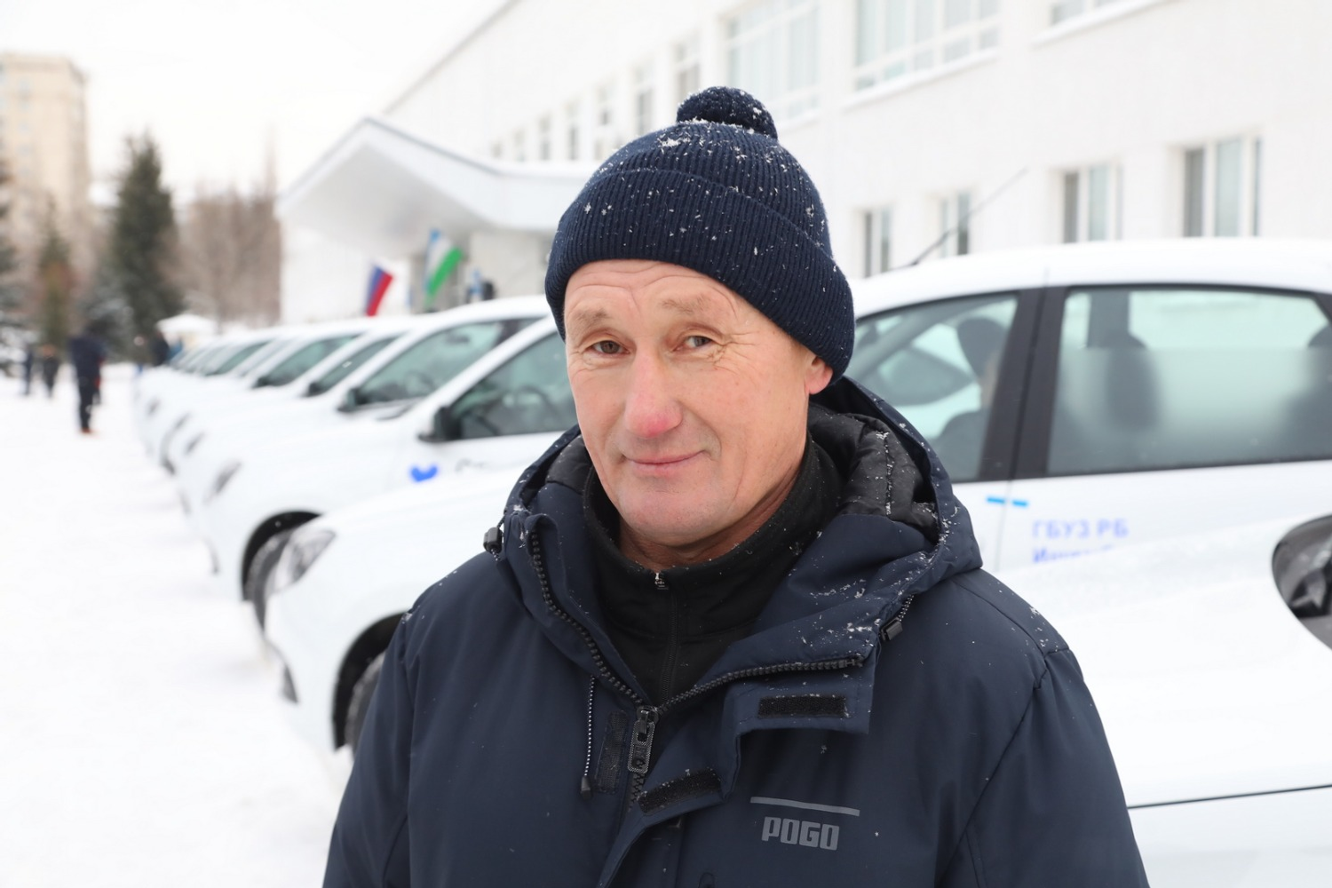 Роман Шафиков работает водителем в Нефтекамской районной больнице 28 лет. Сегодня автопарк этого медучреждения полнился еще на два автомобиля Lada Granta.